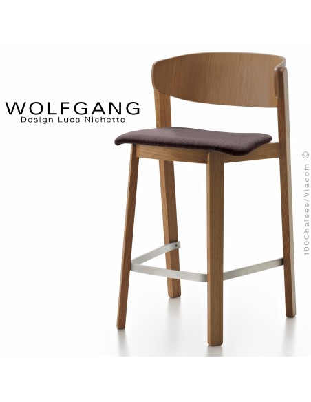 Tabouret design en bois de chêne WOLFGANG, pour cuisine et îlot central, vernis noyer, assise habillage tissu.
