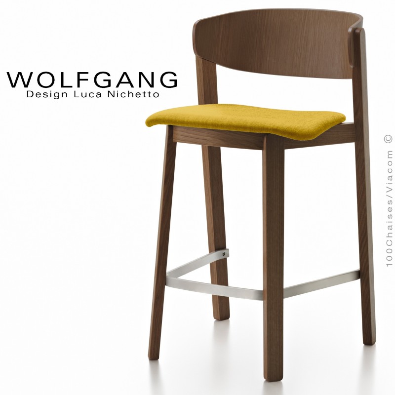 Tabouret design en bois de chêne WOLFGANG, pour cuisine et îlot central, vernis noyer, assise habillage tissu.