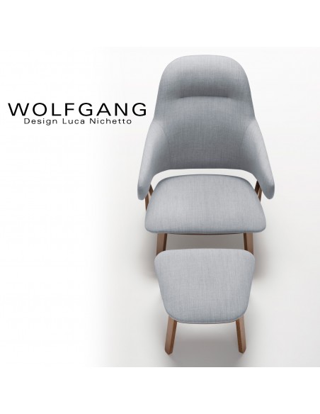 Normes européennesRepose-pieds pour fauteuil lounge assise basse WOLFGANG, assise garnis de mousse polyuréthane. Habillage tissu King-L-Kat du fabricant FIDIVI, 100% fibres de polyester. Classement au feu M1, difficilement inflammable, ne peut être altérée ni par les lavages ni par l’usure. Piètement en bois de chêne, finition vernis au choix ou huilé suivant gamme fabricant.