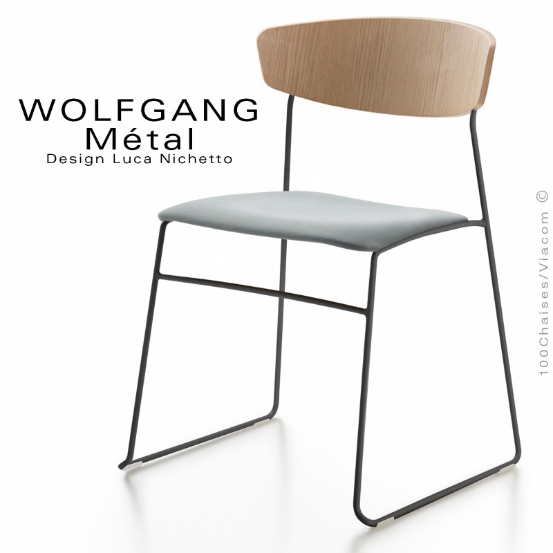 Chaise WOLFGANG Métal, piétement acier peint noir, assise habillage tissu glace, dossier chêne massif naturel