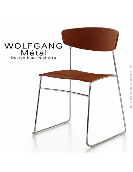 chaise WOLFGANG Métal, structure et piétement chromé, assise et dossier chêne naturel vernis acajou.