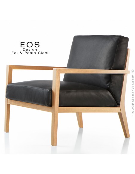 Fauteuil lounge hôtellerie EOS structure chêne, finition naturel, assise et dossier garnis, habillage cuir noir.
