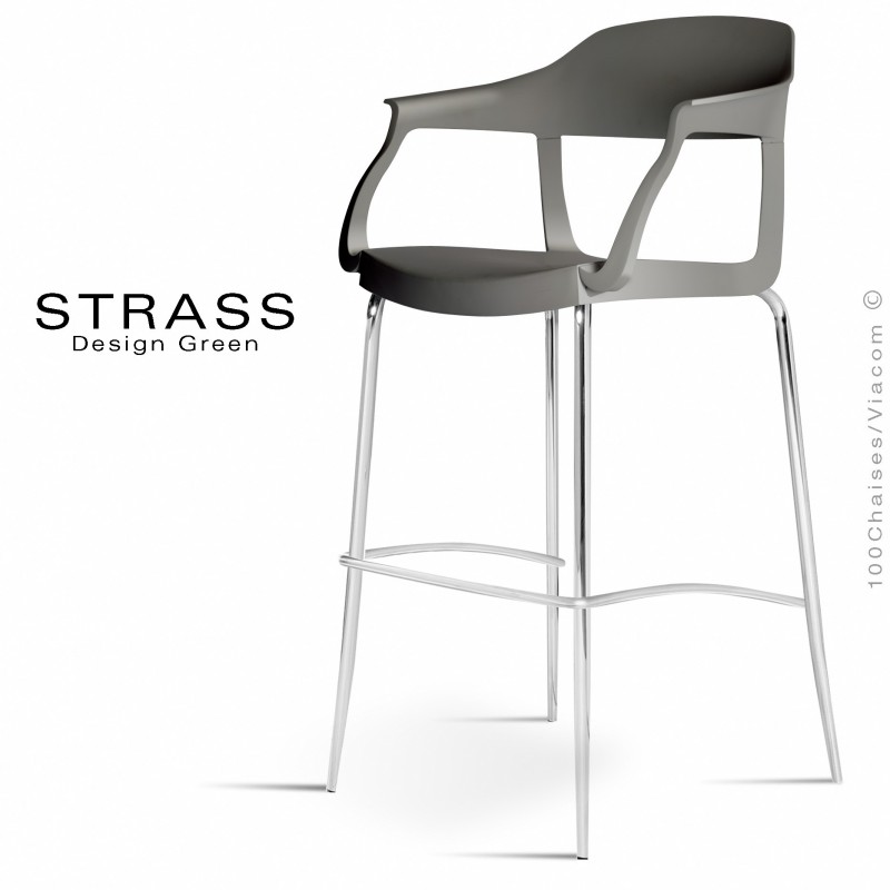 Tabouret de bar STRASS, assise plastique avec accoudoirs, piétement chromé - Lot de 4 pièces, assise couleur anthracite.