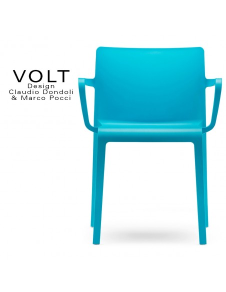 Fauteuil plastique avec accoudoirs pour terrasse et restaurant, CHR, VOLT, structure 4 pieds avec dossier et accoudoirs plastique en polypropylène et fibre de verre, monobloc, teinté dans la masse. Avec tampons plastique de protection des sols, empilable. Couleur disponible : blanc, noir, gris clair, bleu, gris foncé, jaune, rouge, orange. Pour intérieur et extérieur. Sur demande chaise VOLT avec hauteur dossier plus (+) 6 cm. - Lot de 4 pièces.