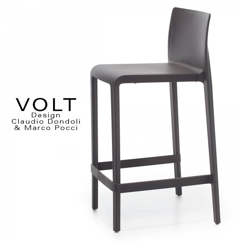 Tabouret plastique de cuisine ou îlot central VOLT, pour la maison mais aussi CHR, collectivités, snack, cafétéria, entreprise. Structure 4 pieds et dossier plastique en polypropylène, monobloc, teinté dans la masse et fibre de verre, hauteur d'assise 66 cm., avec tampons plastique de protection des sols et repose-pieds, mobilier empilable. Couleur disponible : blanc, noir, gris clair, bleu, gris foncé, jaune, rouge, orange teinté dans la masse. Usage intérieur et extérieur - Lot de 2 pièces.