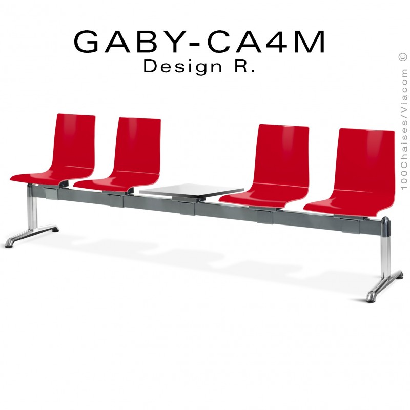 Normes européennesBanc ou assise sur poutre design GABY, pour salle d'attente, assise (4) places coque plastique "Restylon" couleur rouge, blanche, anthracite. Possibilité de patchwork des couleurs d'assise (mélange) info à commandes@100chaises.fr ou sur l'espace "message" lors de votre commande. Structure poutre tube d'acier 80x40 mm., finition peinture polyester argent-gris ou autre voir palette fabricant. Piétement type T en aluminium poli. Plateau porte revue dimensions 450x450 mm., type compact épaisseur 10 mm., finition placage stratifié blanc deux faces, chant noir. Avec tampons plastiques noir de protection des sols.