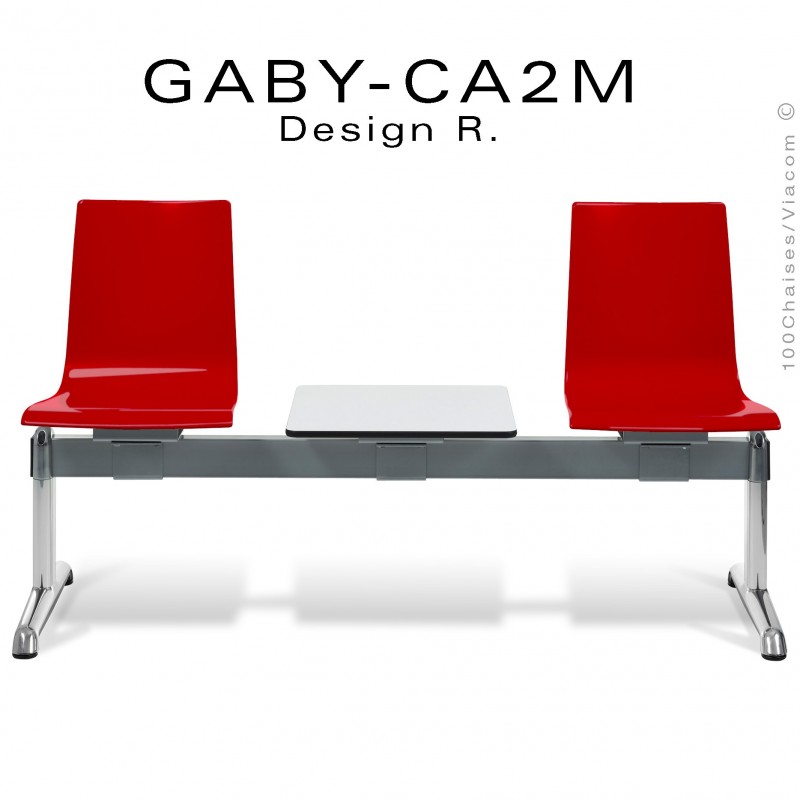 Normes européennesBanc ou assise sur poutre design GABY, pour salle d'attente, assise deux (2) places coque plastique "Restylon" couleur rouge, blanche, anthracite. Possibilité de patchwork des couleurs d'assise (mélange) info à commandes@100chaises.fr ou sur l'espace "message" lors de votre commande. Structure poutre tube d'acier 80x40 mm. finition peinture polyester gris-argent ou autre voir palette peinture au choix. Piétement type T en aluminium poli. Plateau porte revue dimensions 450x450 mm., type compact épaisseur 10 mm., placage stratifié blanc deux faces, chant noir. Avec tampons plastiques noir de protections des sols.