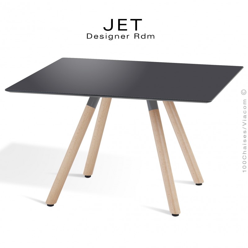 Petite table d'appoint ronde en bois, pour salon lounge, hôtellerie, domestique JET, petite structure sous le plateau en acier, finition peinture polyester grise. Piétement bois de Hêtre massif, 4 pieds ronds Ø30 mm., avec tampons plastiques de protections des sols. Dimension plateau 60x60 cm., type Compact stratifié HPL, épaisseur 10 mm. Chant incliné sous plateau 45°, de  couleur noir ou blanc. Finition stratifié plateau suivant gamme fabricant. Convient essentiellement pour l'intérieur. Autre finition possible, vos demandes à commandes@100chaises.fr