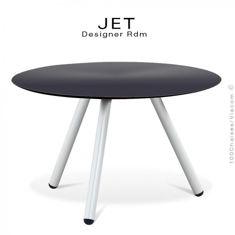 Normes européennesPetite table d'appoint ronde, pour salon lounge, salle d'attente, hôtellerie, domestique JET, structure et piétement tube d'acier, 3 pieds ronds Ø30 mm., finition peinture polyester au choix voir gamme fabricant. Avec tampons plastiques de protections des sols. Dimension plateau Ø60 cm. Type Compact stratifié HPL, épaisseur 10 mm. Avec chant incliné sous plateau 45°, de couleur noir ou blanc. Couleur plateau suivant gamme fabricant. Convient essentiellement pour l'intérieur et l'extérieur - Autre finition possible sur demande à commandes@100chaises.fr