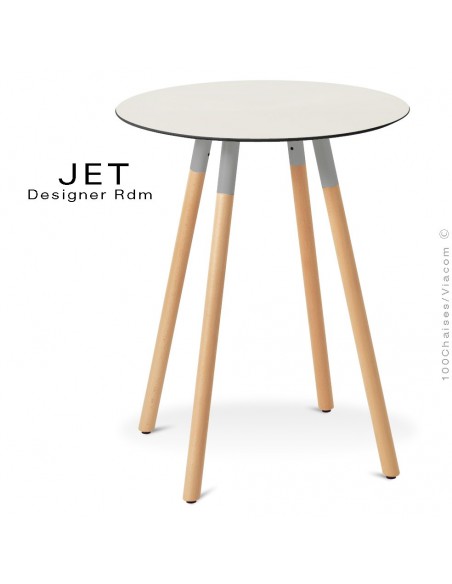 Normes européennesPetite table ronde en bois pour café ou snack, hôtellerie, domestique JET, petite structure sous le plateau en tube d'acier, finition peinture polyester grise (ou autre sur demande suivant palette). Piétement bois de Hêtre massif, 3 pieds ronds Ø30 mm., avec tampons plastiques de protections des sols. Dimensions plateaux : Ø60 ou 70 cm., type Compact, finition placage stratifié HPL, épaisseur 10 mm., avec chant incliné sous plateau 45°, de couleur noir. Couleur plateau suivant gamme fabricant. Convient essentiellement pour l'intérieur - Vos demandes spécifique à commandes@100chaises.fr