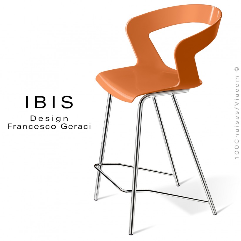 Normes européennesTabouret design IBIS, assise coque plastique en polypropylène, monobloc, teinté dans la masse. Sept couleur disponible, anthracite, blanche, ivoire, gris petit gris, vert pomme, gris Tourterelle, orange voir palette. Option coussin d'assise amovible type feutre de couleur anthracite ou sable. Piétement 4 pieds avec repose-pieds, structure en rond d'acier Ø10 mm., finition chromé brillant ou peint au choix voir palette. Convient essentiellement pour l'intérieur.