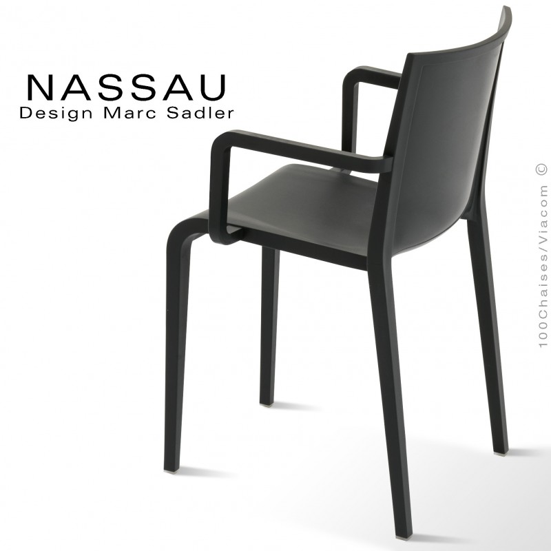 Fauteuil design d'extérieur NASSAU structure monobloc en polypropylène (plastique), moulée par injection "Air Moulding", teinté dans la masse. Avec accoudoirs, piètement quatre pieds avec tampons plastiques de protection des sols. Couleur disponible : blanc pur, bleu Capri, gris petit gris, vert olive, gris tourterelle, rouge Marsala, jaune curry, anthracite ou noir. Mobilier empilable afin de facilité le rangement, option disponible chariot de manutention sur roulettes.
