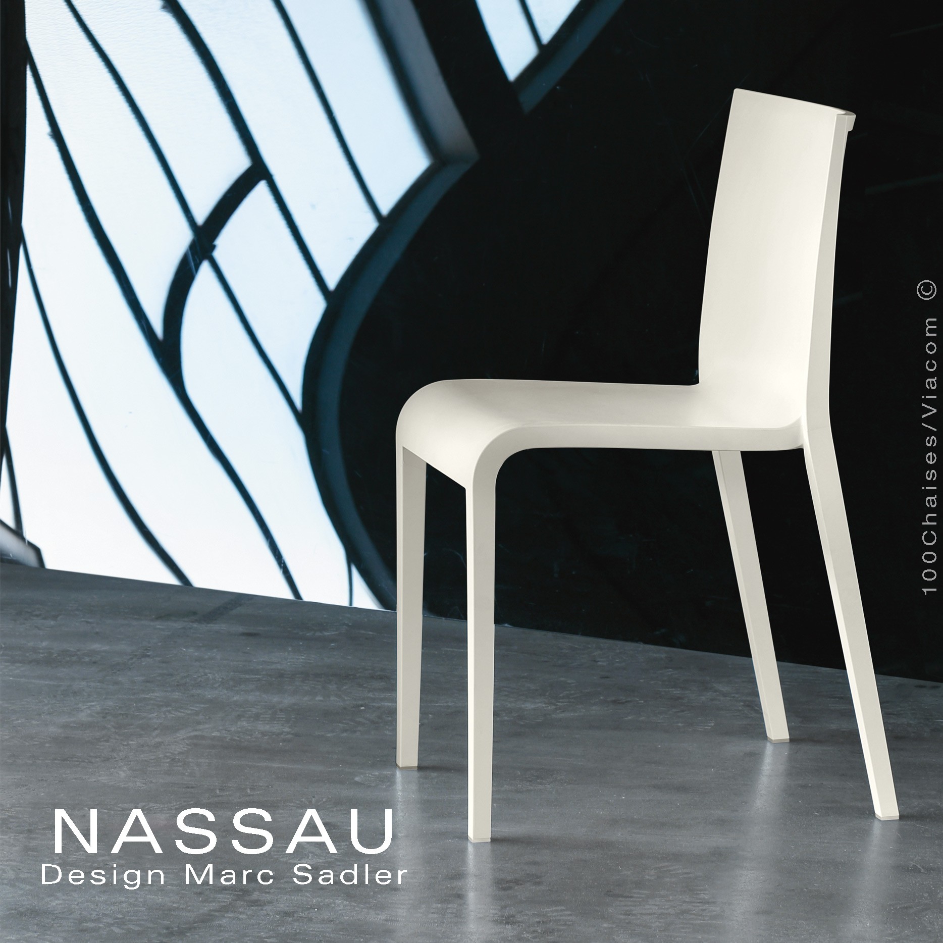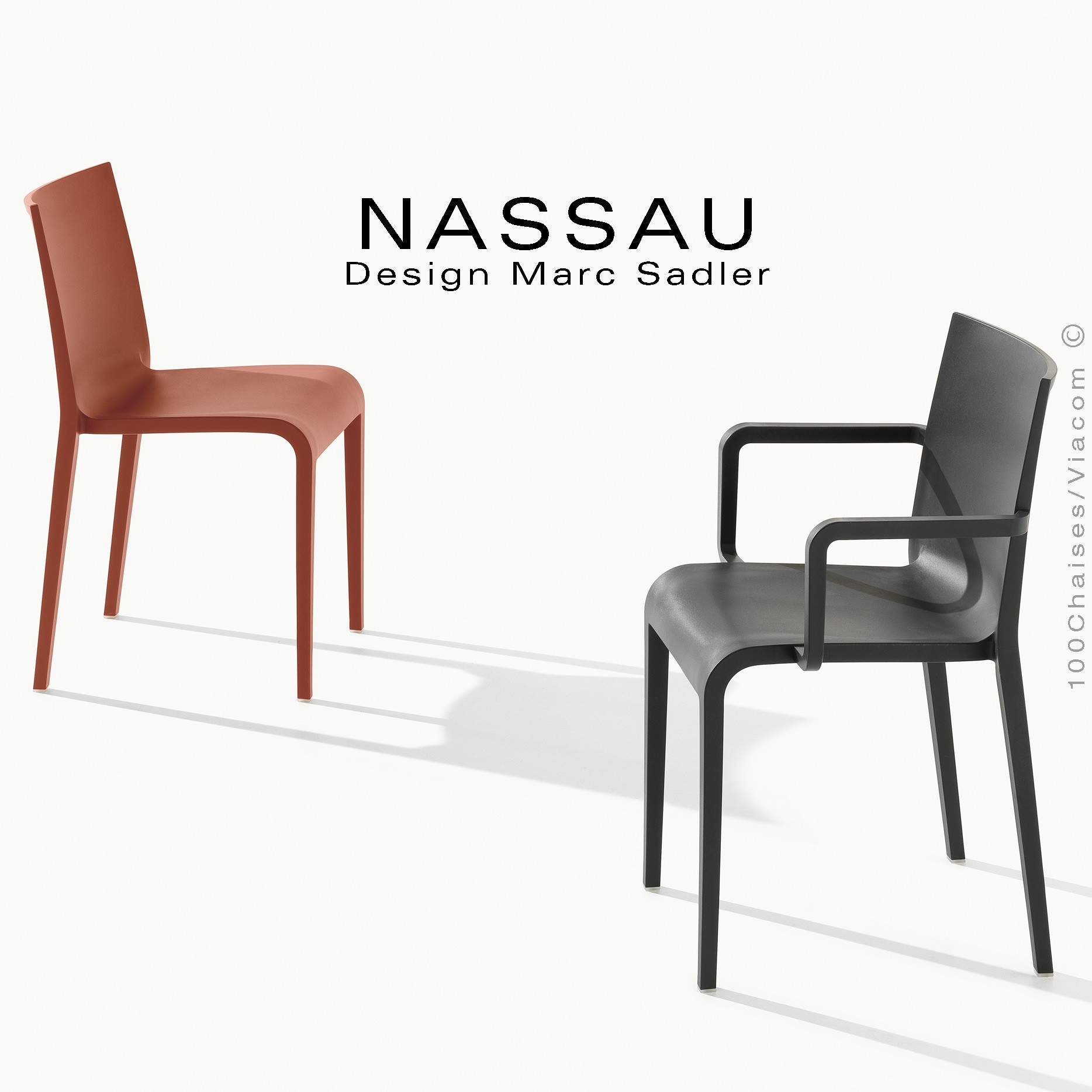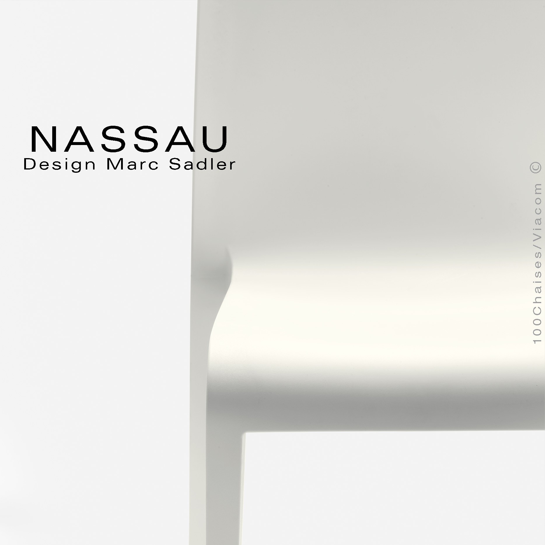Nassau est une collection de chaise, fauteuil et tabouret, monobloc en polypropylène renforcé de fibre de verre et moulée par injection selon la technologie «Air Moulding», qui la rend robuste et légère en même temps. Les lignes arrondies, le design essentiel et les formes sinueuses distinguent son caractère. Le dossier ergonomique et la finition brillante sur l’arrière du dos s'insère dans un cadre imaginaire qui valorise son importance. L’assise qui s’accorde au dossier crée en outre une continuité esthétique. Disponible en 10 coloris (blanc, azur, gris souris, vert pelouse, tourterelle, ocre, marsala, moka, anthracite et noir), Nassau est conçue pour une utilisation à l’intérieur et à l’extérieur. Elle est empilable par 5 pièces pour faciliter la manipulation durant le stockage et les patins transparents sont également en polypropylène.