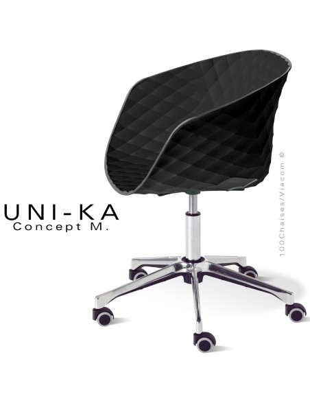 Fauteuil de bureau design UNI-KA, assise chic et tendance coque plastique effet matelassé, monobloc, teinté dans la masse. Assise pivotante à 360°. Couleur assise disponible : anthracite - argile - blanche - bleu poudre - gris petit gris - gris Tourterelle - noir - vert Olive - vert Pistache - rouge Corail de couleur voir palette au choix. Piétement 5 branches en fonte d'aluminium billant ou noir (black) avec roulettes plastique. Assise sur colonne centrale avec élévation par vérin à gaz, tube d'acier Ø12 mm., finition acier chromé. Convient essentiellement pour l'intérieur.
