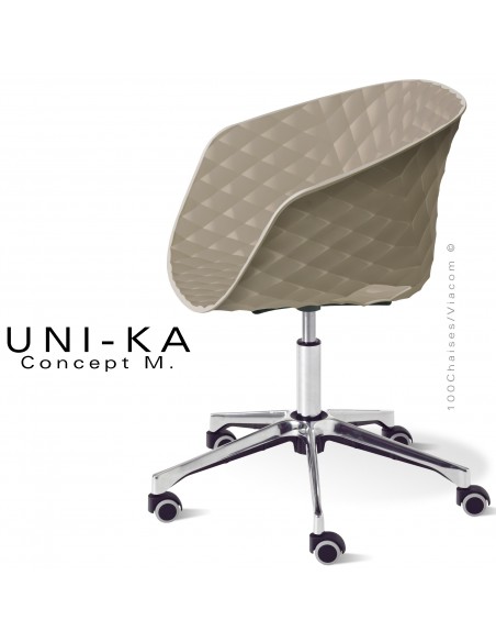 Fauteuil de bureau design UNI-KA, assise chic et tendance coque plastique effet matelassé, monobloc, teinté dans la masse. Assise pivotante à 360°. Couleur assise disponible : anthracite - argile - blanche - bleu poudre - gris petit gris - gris Tourterelle - noir - vert Olive - vert Pistache - rouge Corail de couleur voir palette au choix. Piétement 5 branches en fonte d'aluminium billant ou noir (black) avec roulettes plastique. Assise sur colonne centrale avec élévation par vérin à gaz, tube d'acier Ø12 mm., finition acier chromé. Convient essentiellement pour l'intérieur.