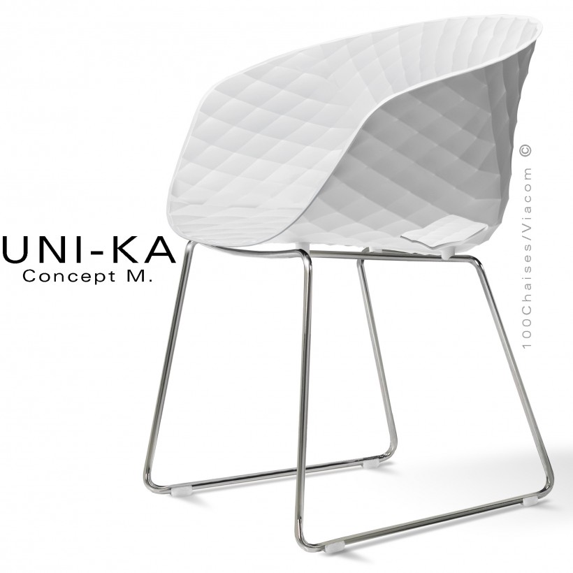 Fauteuil design UNIKA, coque plastique couleur blanche effet matelassé, piétement luge chromé brillant.