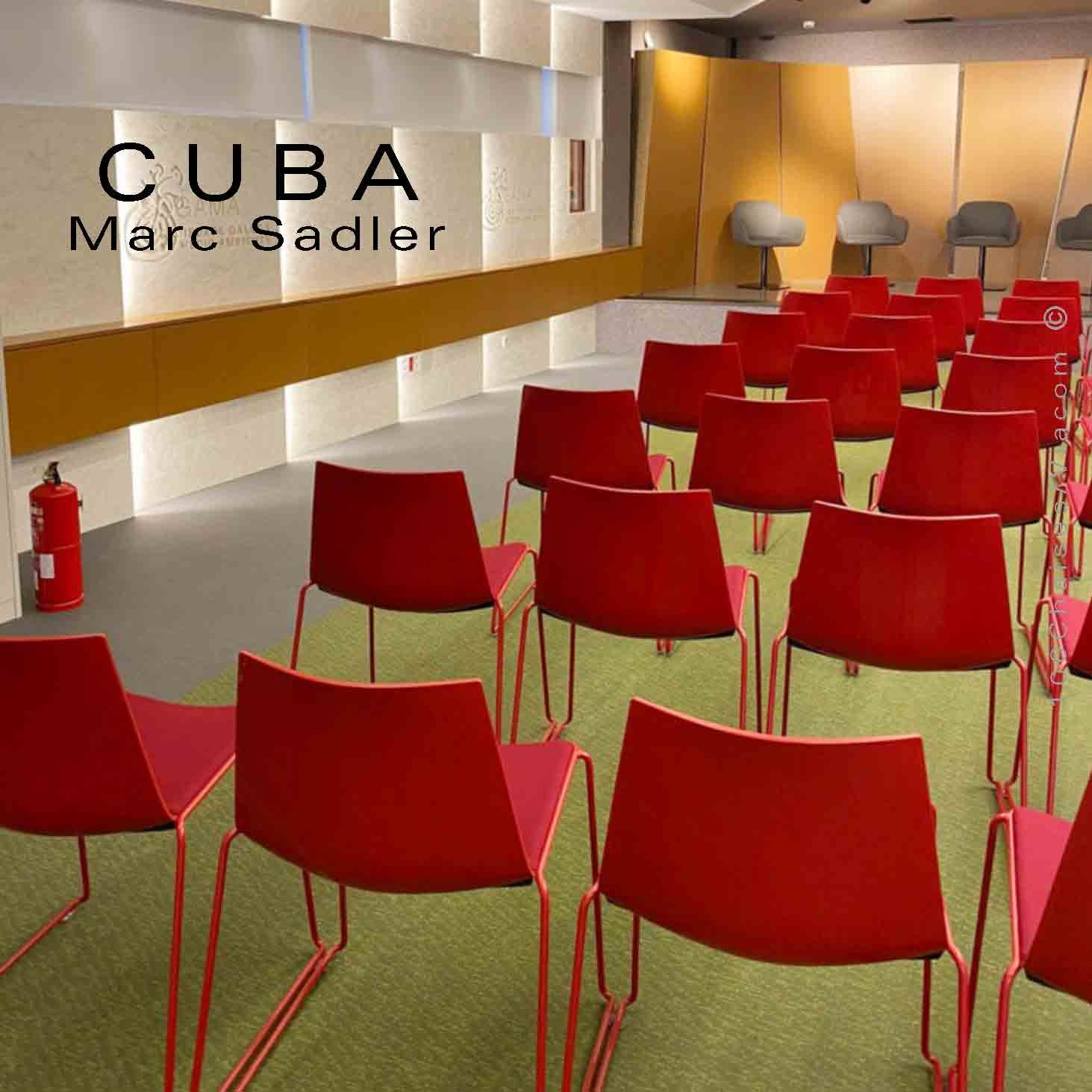 Chaise design CUBA, assise coque plastique couleur, piétement luge acier peint ou chromé brillant.