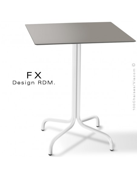 Normes européennesTable FX pour terrasse, CHR, piétement en tube acier Ø20 mm., colonne centrale 4 tubes, terminaison 4 branches. Finition piétement peinture au choix. Plateau type Compact, épaisseur de 10 mm., chant plateau incliné sous à 45° de couleur noir. Disponible en Ø600 mm., ou 600x600 mm. Plateau disponible en Blanc, gris ou noir. Autre finitions possible plateau et piétement sur demande.