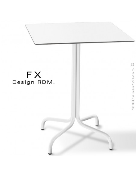 Normes européennesTable FX pour terrasse, CHR, piétement en tube acier Ø20 mm., colonne centrale 4 tubes, terminaison 4 branches. Finition piétement peinture au choix. Plateau type Compact, épaisseur de 10 mm., chant plateau incliné sous à 45° de couleur noir. Disponible en Ø600 mm., ou 600x600 mm. Plateau disponible en Blanc, gris ou noir. Autre finitions possible plateau et piétement sur demande.
