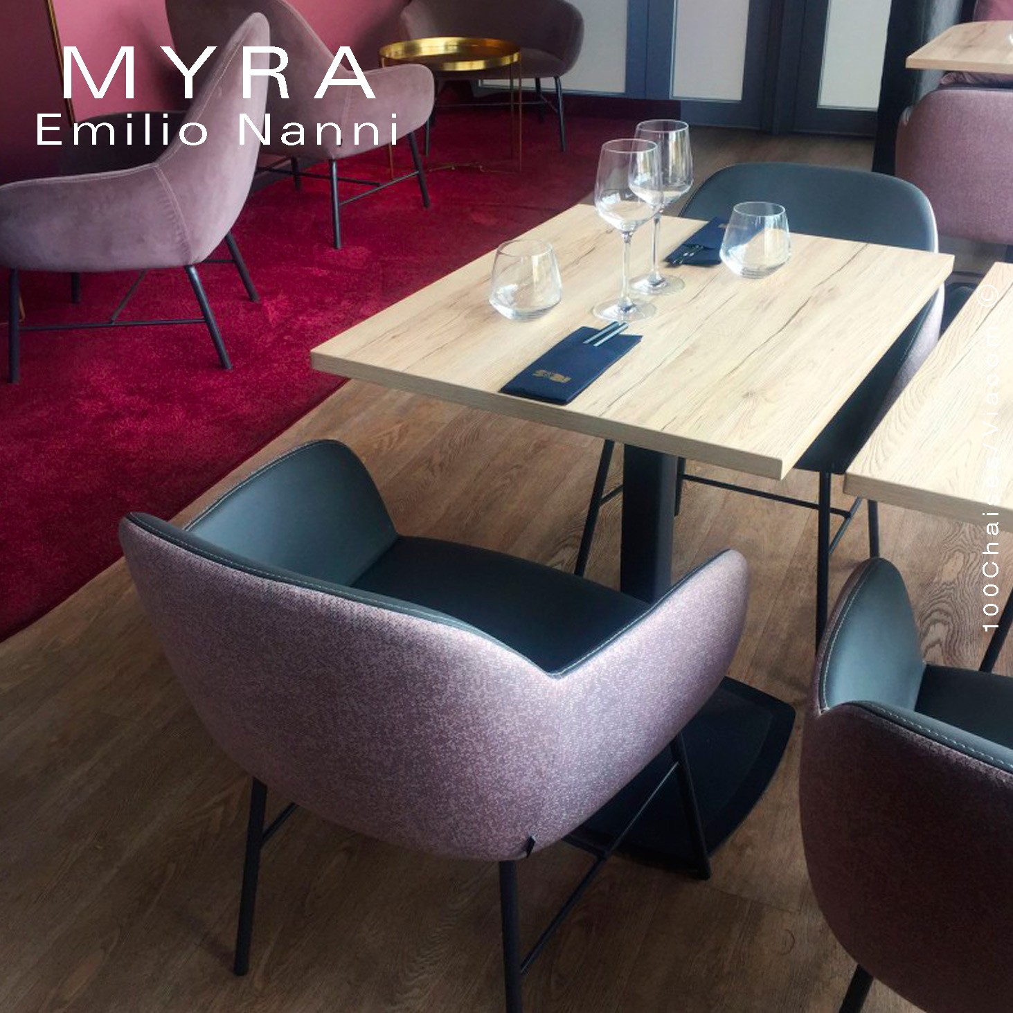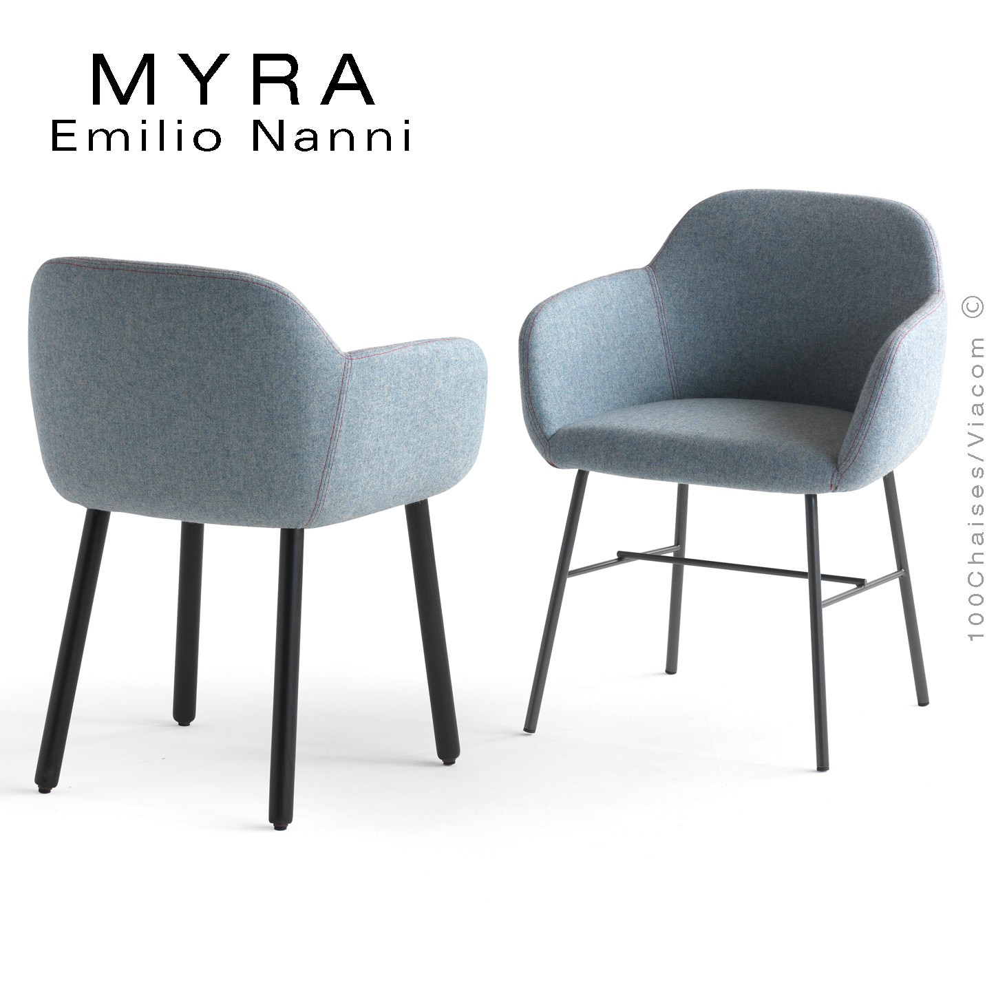 Fauteuil design MYRA, pour hôtel, café, restaurant, CHR, mais aussi pour la maison ou les collectivités. Assise et dossier garnis de mousse polyuréthane, habillage tissu gamme Medley du fabricant Gabriel, composition 100% PL., ignifugé - BS EN 1021 1&2 Cigarette and Match. Couleur voir palette tissu au choix. Piétement 4 pieds en tube d'acier Ø15 mm. Finitions peint ou chromé brillant (voir palette finition fabricant possible). Avec tampons plastiques de protections des sols. Autres tissus tissés, feutres ou aspects cuir synthétique disponible. Vos demandes à commandes@100chaises.fr