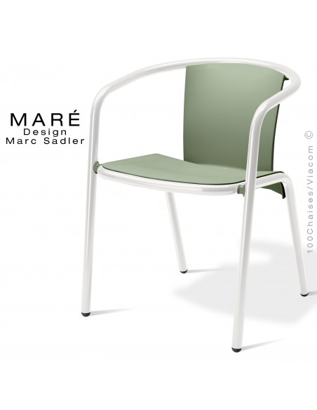 Fauteuil MARÉ, pour terrasse de café piétement aluminium peint blanc, assise plastique vert