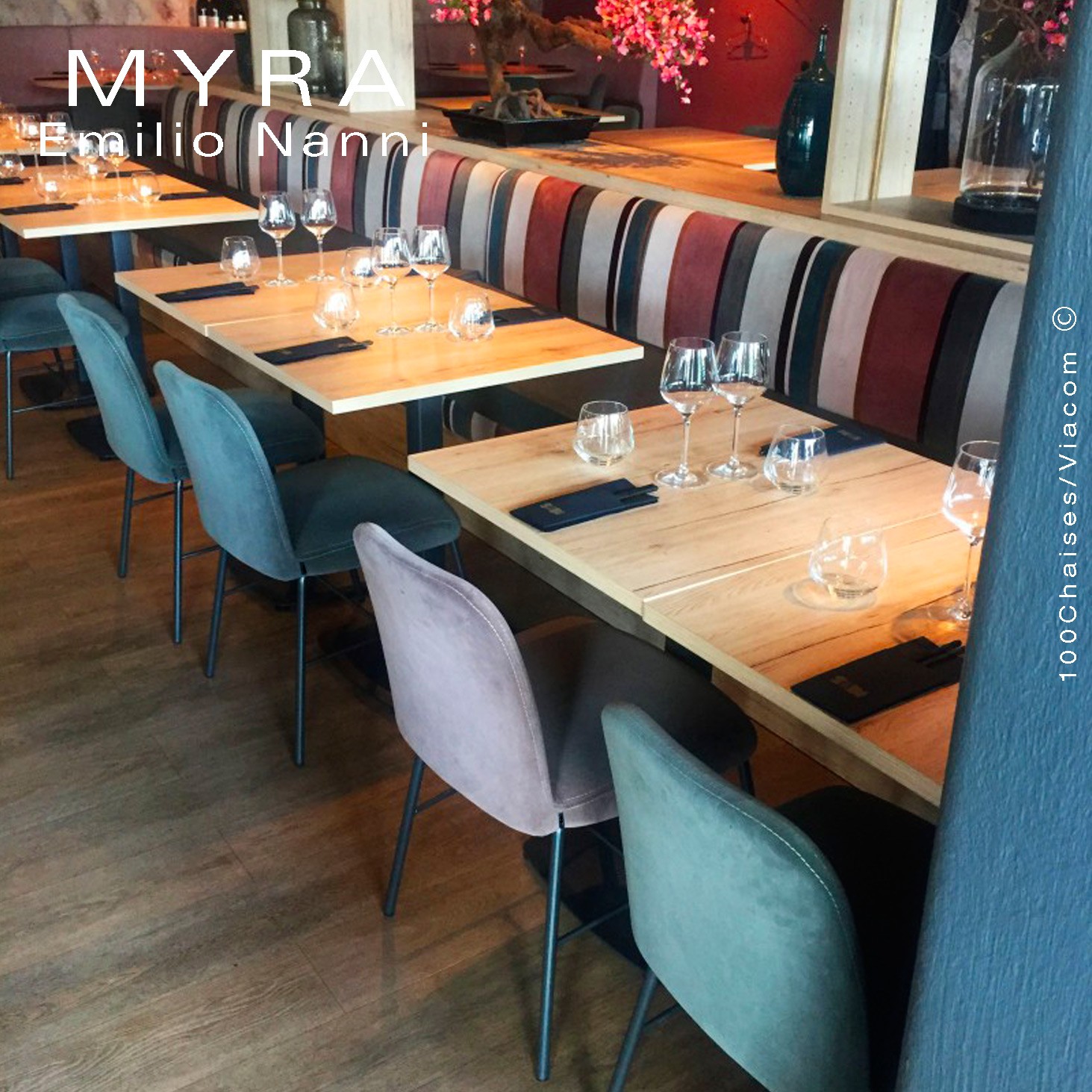 Chaise design MYRA pour hôtel, café, restaurant, CHR, mais aussi pour la maison. Assise et dossier garnis de mousse, habillage tissu gamme Medley du fabricant Gabriel, composition 100% PL., ignifugé - BS EN 1021 1&2 Cigarette and Match. Couleur voir palette tissu au choix. Piétement 4 pieds en bois de massif de hêtre de Ø40 mm., teinté au choix (voir palette fabricant). Avec tampons plastiques de protection des sols. Autres tissus tissés, feutre ou aspect cuir synthétique disponible. Vos demandes à commandes@100chaises.fr - Lot de 2 pièces.