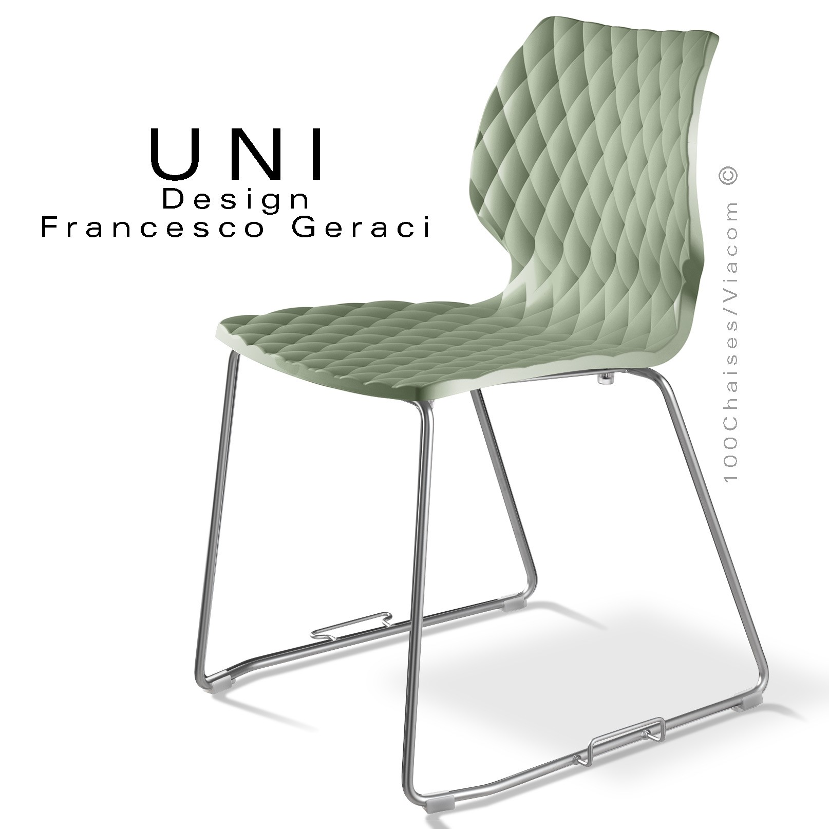 Chaise design UNI, assise coque plastique effet matelassé couleur en polypropylène, monobloc, teinté dans la masse. Couleurs disponibles : anthracite - argile - blanche - bleu poudre - gris petit gris - gris Tourterelle - noir - vert Olive - vert Pistache - rouge Corail de couleur voir palette au choix. Piétement type luge en rond d'acier Ø10 mm., finition peinture au choix ou chromé brillant avec tampons plastiques de protection des sols. Convient essentiellement pour l'intérieur en version chromé, pour l'extérieur finition peinture, empilable - Lot de 4 pièces.