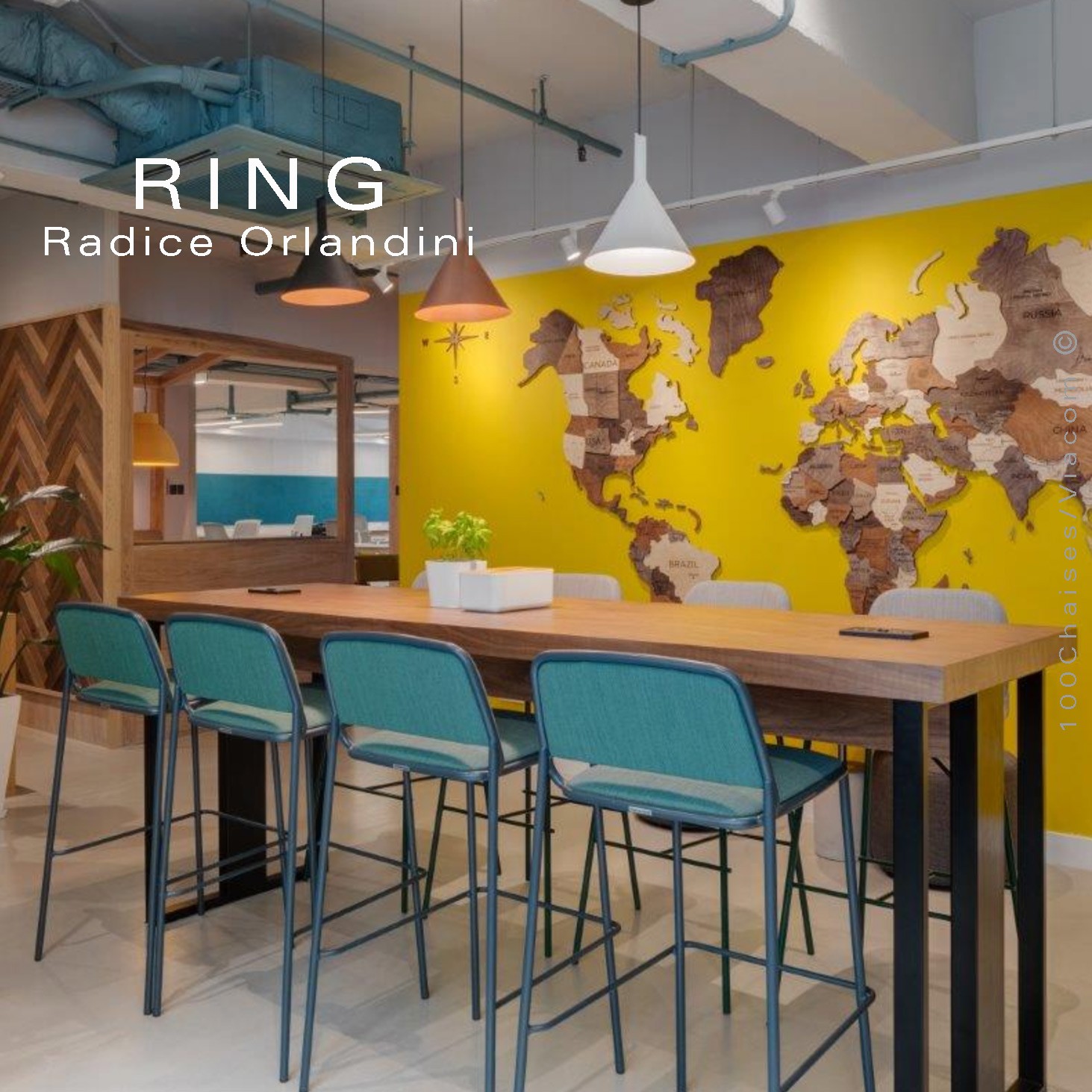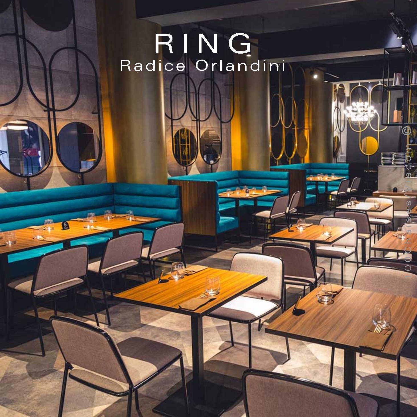 Ligne de sièges composée de chaises, fauteuils et tabourets, caractérisée par une linéarité extrême et par une grande simplicité de construction : châssis monobloc en tubulaire d’acier avec l’ajout de deux coussins visant à créer un ensemble souple, léger et fonctionnel. La structure portante se transforme en élément décoratif, «le tube devient une ligne graphique continue qui enlace et supporte les coques rembourrées» (Radice Orlandini Design Studio). Les rembourrages de forme souple et lenticulaire, et leur rapport géométrique avec le tube périphérique assurent pureté et design de la collection. Les deux anneaux, celui du siège et celui du dossier, d’où provient le nom de la collection, Ring, sont entrelacés entre eux et le châssis à 4 pieds s’y intègre, créant un jeu de liaisons inédit entre les différents éléments.