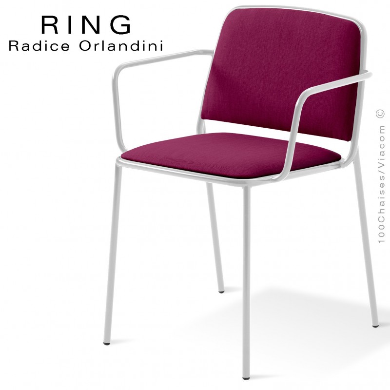 Fauteuil RING, assise et dossier garnis, piétement acier peint blanc, habillage tissu violet