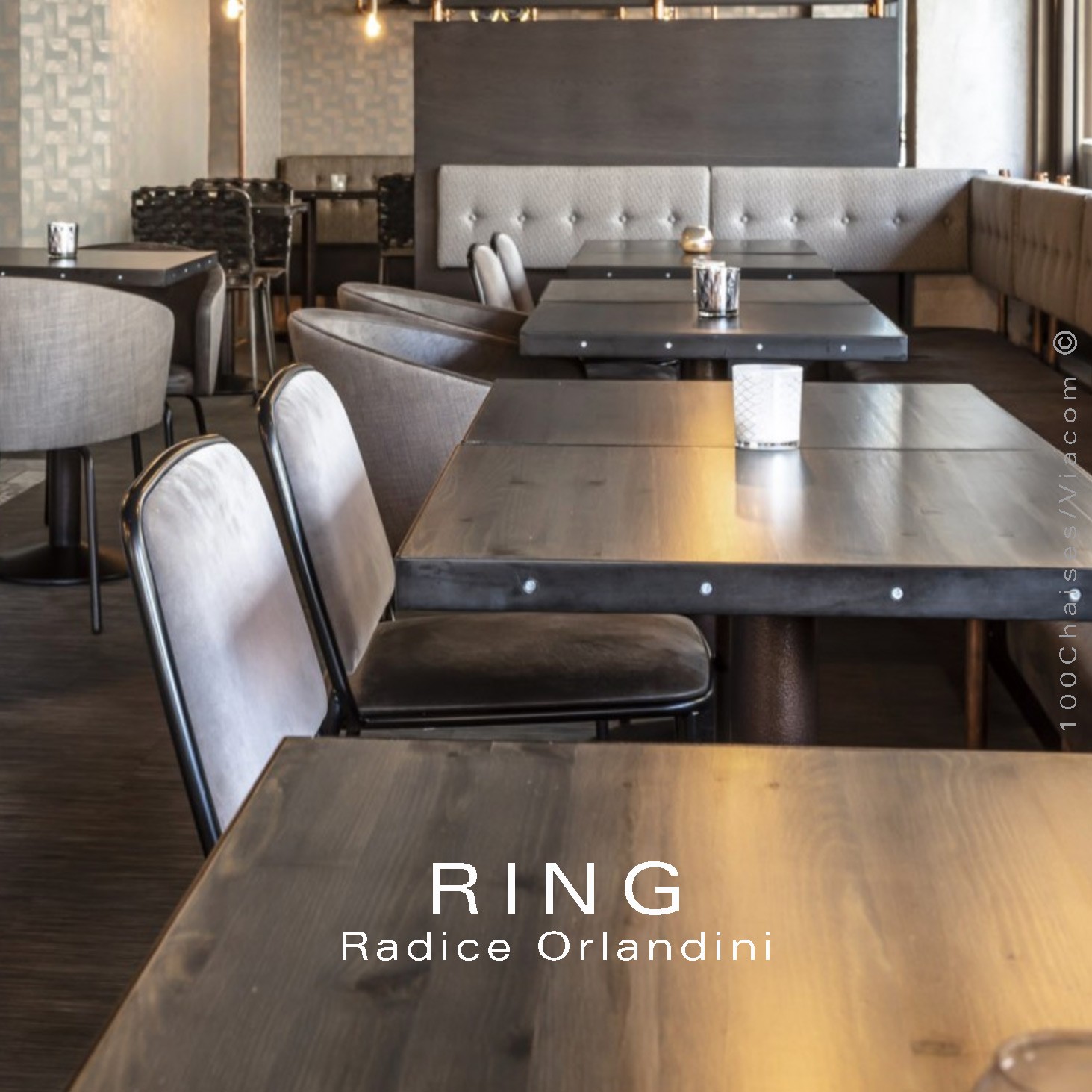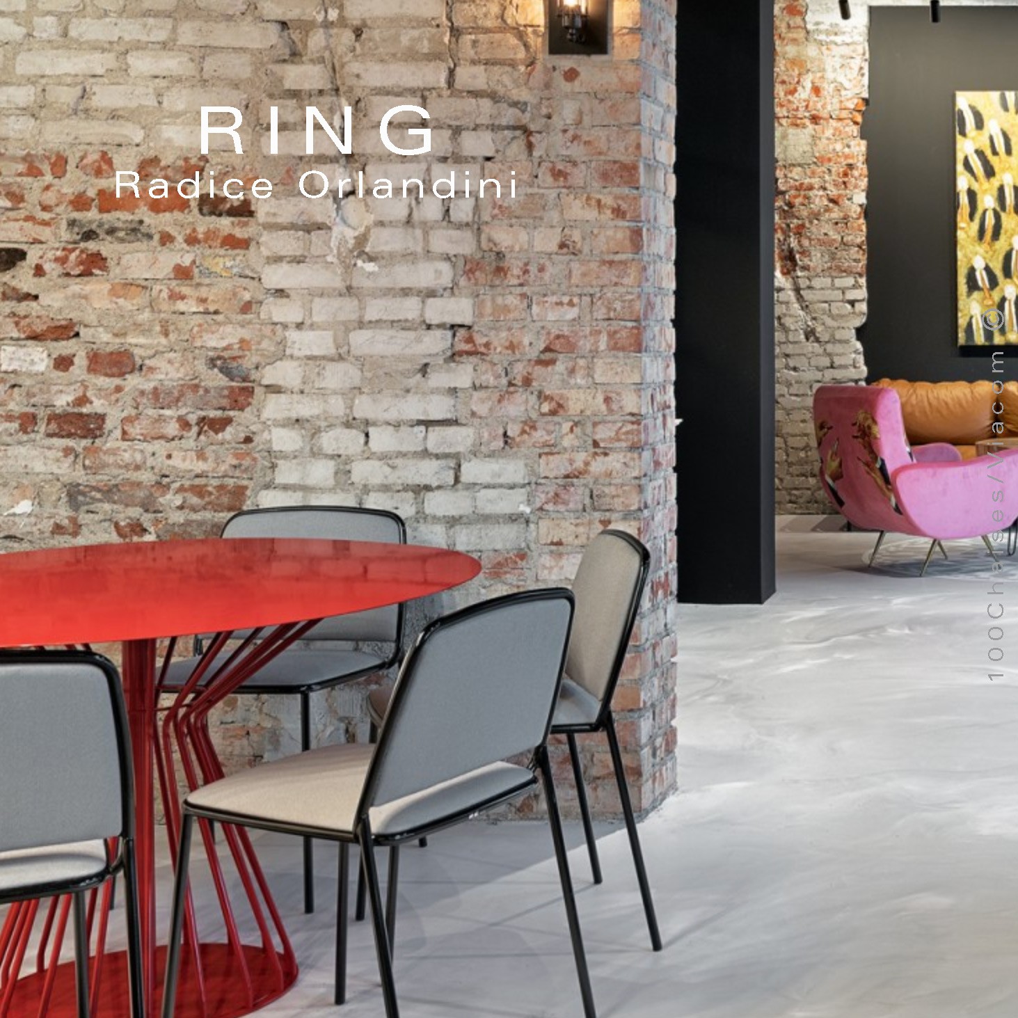 Ligne de sièges composée de chaises, fauteuils et tabourets, caractérisée par une linéarité extrême et par une grande simplicité de construction : châssis monobloc en tubulaire d’acier avec l’ajout de deux coussins visant à créer un ensemble souple, léger et fonctionnel. La structure portante se transforme en élément décoratif, «le tube devient une ligne graphique continue qui enlace et supporte les coques rembourrées» (Radice Orlandini Design Studio). Les rembourrages de forme souple et lenticulaire, et leur rapport géométrique avec le tube périphérique assurent pureté et design de la collection. Les deux anneaux, celui du siège et celui du dossier, d’où provient le nom de la collection, Ring, sont entrelacés entre eux et le châssis à 4 pieds s’y intègre, créant un jeu de liaisons inédit entre les différents éléments.