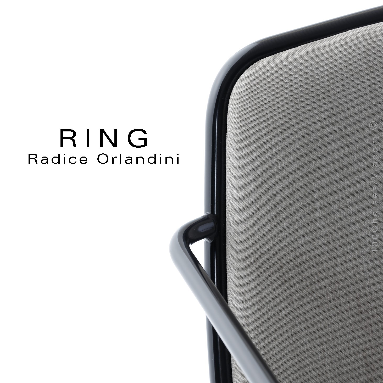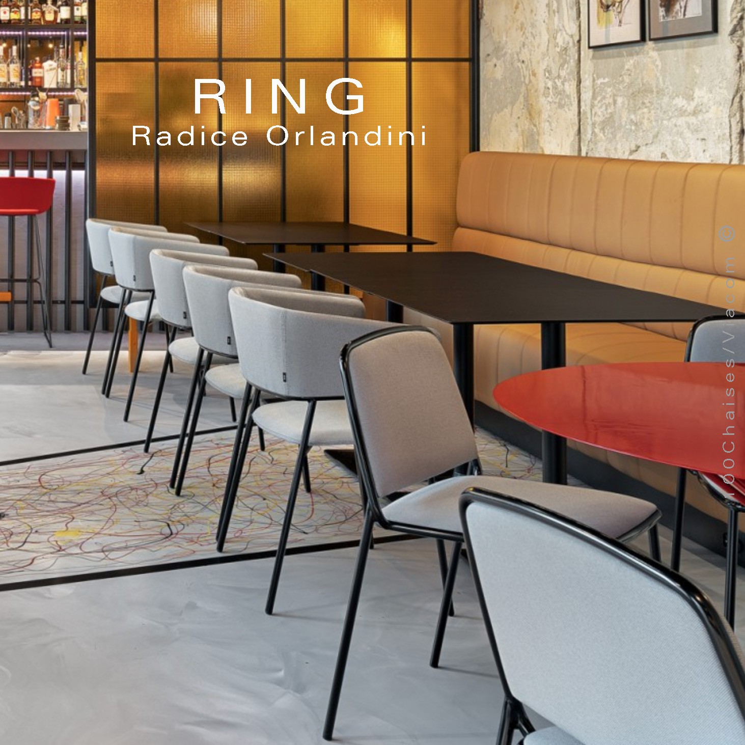 Fauteuil confort design RING, pour cuisine, salle à manger, salle de restauration CHR. Ce fauteuil se caractérise par une linéarité extrême et par une grande simplicité : structure tubulaire acier Ø15 mm., finition peinture avec tampons plastiques de protections des sols. Assise et dossier garnis de mousse polyester, habillage tissu gamme Medley du fabricant Gabriel, composition 100% PL., ignifugé - BS EN 1021 1&2 Cigarette and Match. Couleur tissu au choix voir palette tissu fabricant. Autre gamme disponible sur demande, tissu tissé, feutre 100% laine, velours, aspect cuir synthétique pour collectivités. Vos demandes à commandes@100chaises.fr