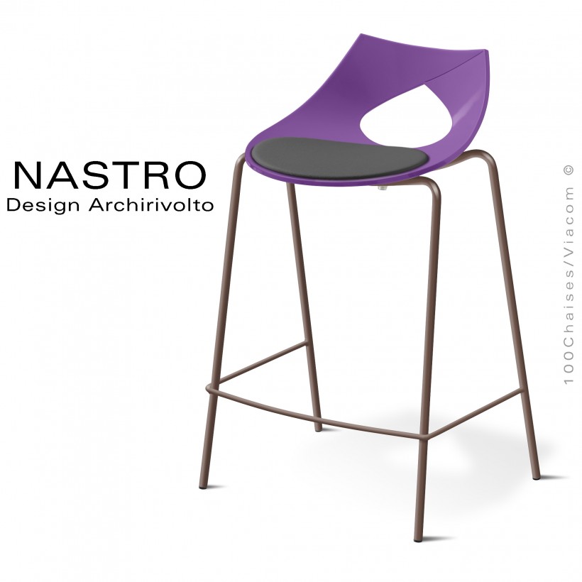 Normes européennesTabouret de cuisine design NASTRO, assise coque plastique "Restylon" monobloc teinté dans la masse. Couleurs disponible noir, blanc, anthracite, vert pomme, violet et taupe. Option coussin d'assise aspect cuir synthétique, gamme Ginkgo du fabricant Griffine, composition 85% PVC, 15% coton. épaisseur 1,3 mm. Certification feu M1 (NFP 92503), AM18 (NFD 60-013), EN 1021.1-2 . Couleur coussin en standard anthracite (autre sur demande voir gamme fabricant). Piétement 4 pieds avec repose-pieds en tube d'acier Ø16 mm., finition structure peinture polyester ou chromé brillant. Avec tampons plastiques de protection des sols. Convient essentiellement pour l'intérieur. Empilable.