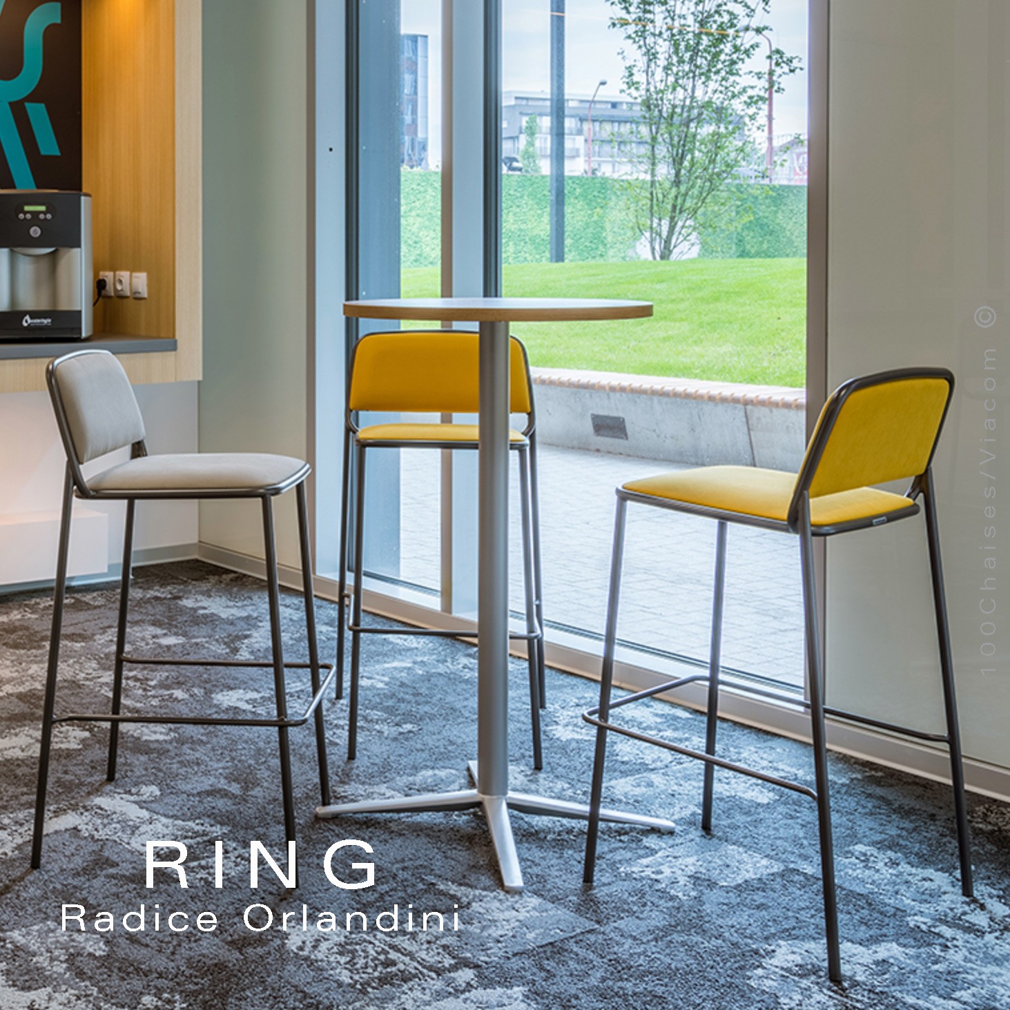 La structure de RING portante se transforme en élément décoratif, «le tube devient une ligne graphique continue qui enlace et supporte les coques rembourrées» (Radice Orlandini Design Studio).