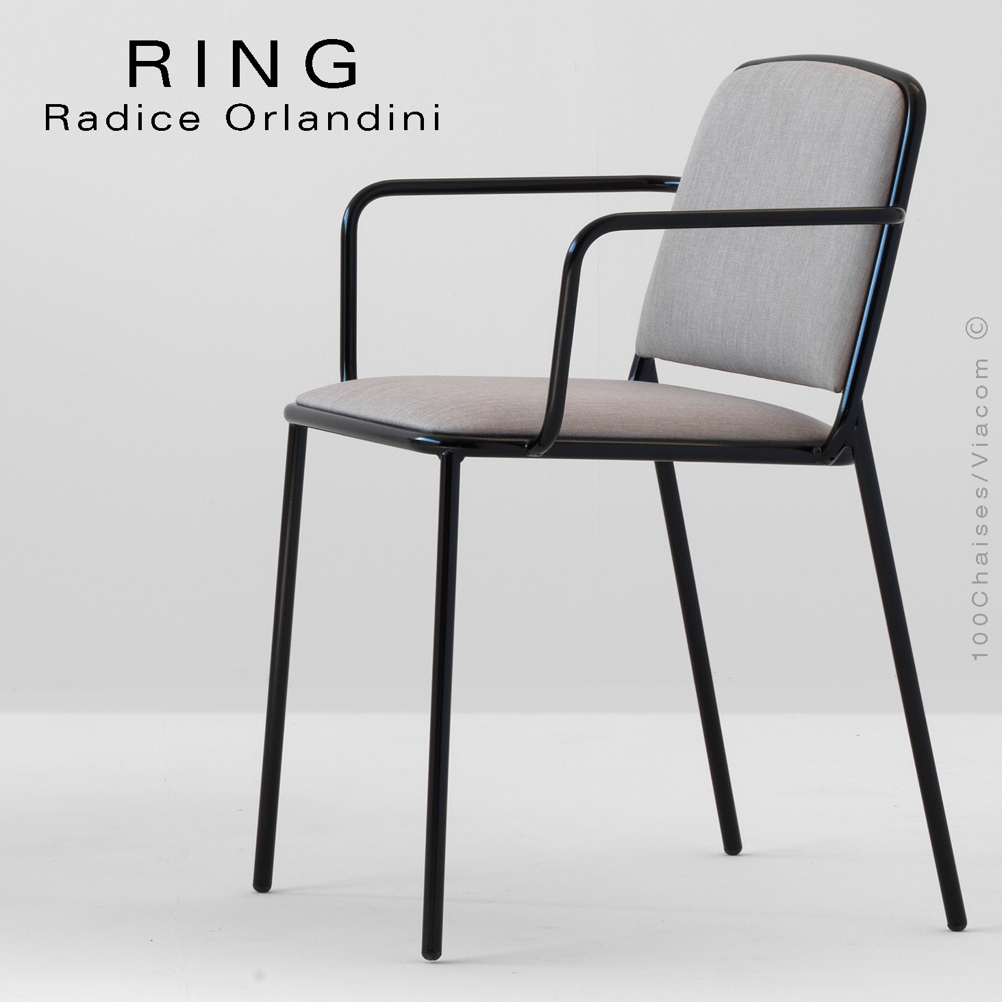 Ligne de sièges composée de chaises, fauteuils et tabourets, caractérisée par une linéarité extrême et par une grande simplicité de construction : châssis monobloc en tubulaire d’acier avec l’ajout de deux coussins visant à créer un ensemble souple, léger et fonctionnel. La structure portante se transforme en élément décoratif, «le tube devient une ligne graphique continue qui enlace et supporte les coques rembourrées» (Radice Orlandini Design Studio). Les rembourrages de forme souple et lenticulaire, et leur rapport géométrique avec le tube périphérique assurent pureté et design de la collection. Les deux anneaux, celui du siège et celui du dossier, d’où provient le nom de la collection, Ring, sont entrelacés entre eux et le châssis à 4 pieds s’y intègre, créant un jeu de liaisons inédit entre les différents éléments.