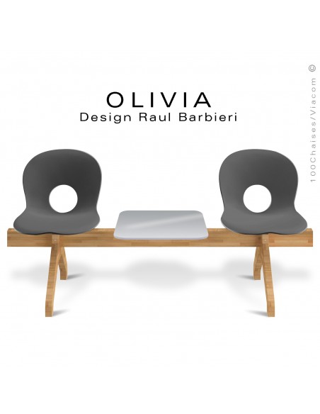 Banc design OLIVIA, piétement bois, assise 2 places coque plastique couleur anthracite avec tablette grise.