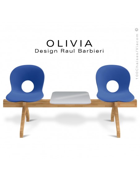 Banc design OLIVIA ou assise sur poutre, 2 places, structure 4 pieds, hêtre lamellé-collé, traité à l'épreuve du feu. Assise coque plastique couleur en polypropylène renforcé stabilisé au U.V. teinté dans la masse. Tablette 450x450 mm. type Agglo. épaisseur 12 mm. finition plaquage stratifié blanc ou gris clair avec traitement anti rayures. Avec patins réglables. Option : accoudoirs acier chromé.