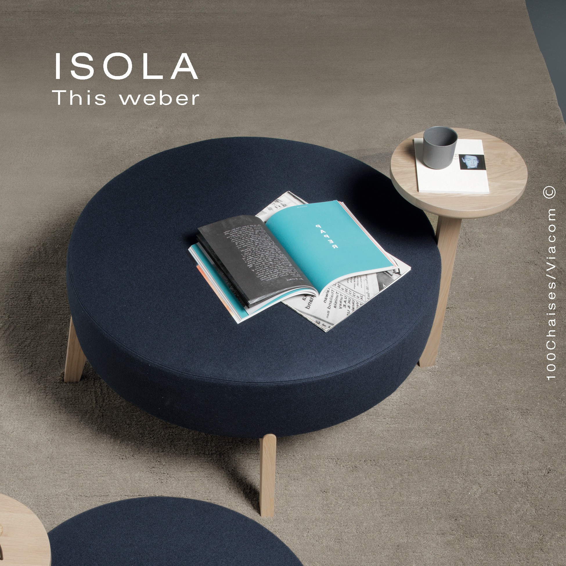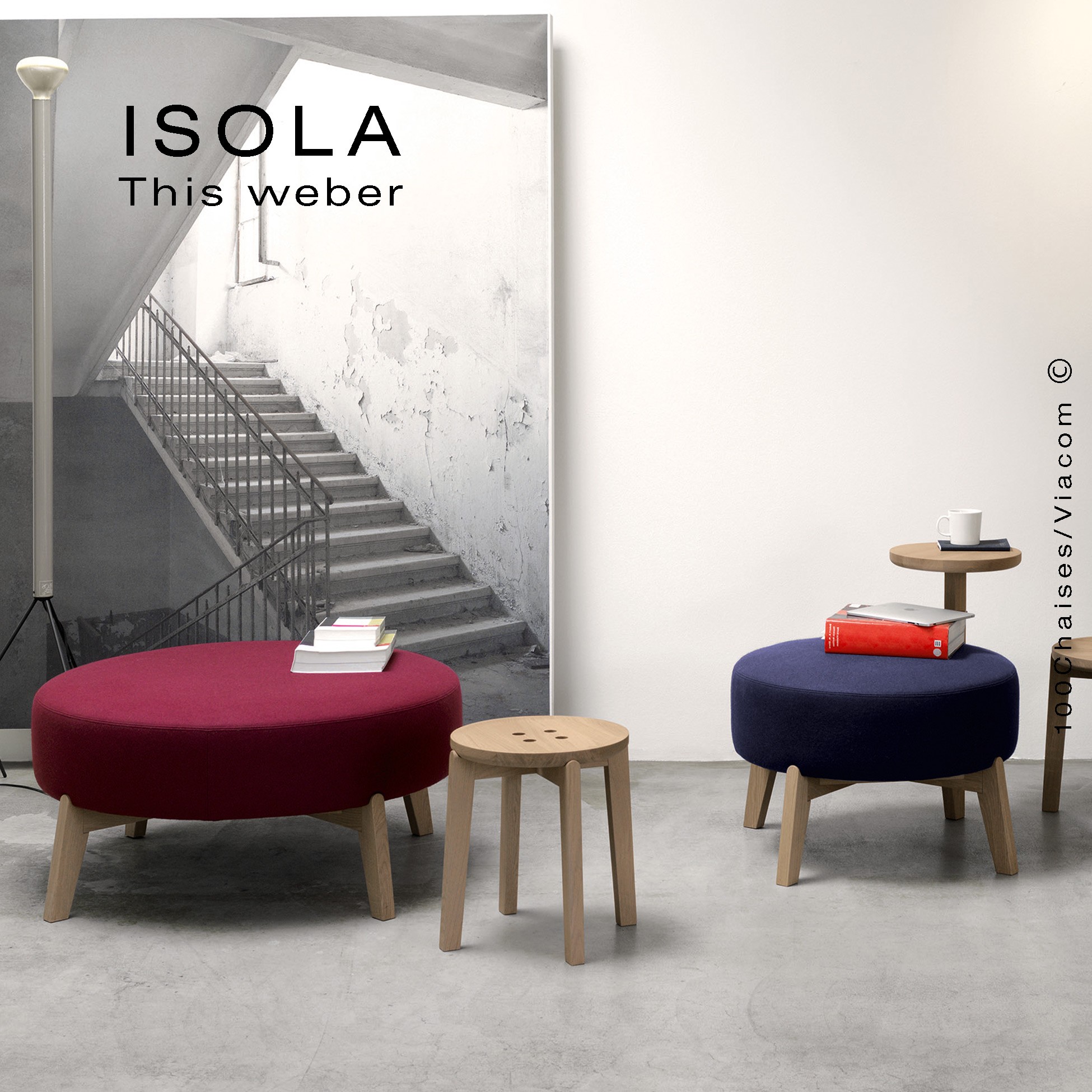 Pouf design ISOLA-90/TR, piétement bois massif de chêne vernis, assise garnie de mousse, habillage tissu.