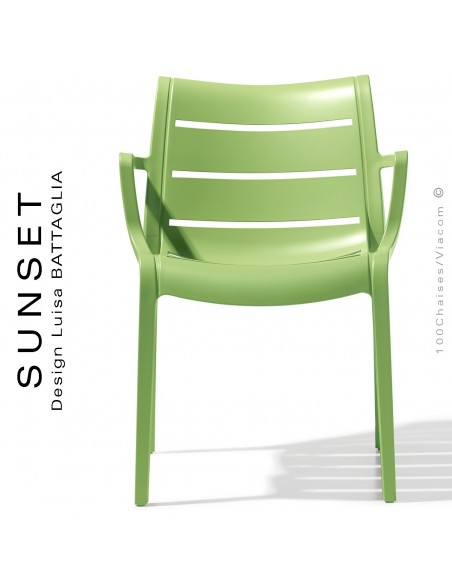 Fauteuil SUNSET, structure plastique couleur vert Pistache avec accoudoirs, empilable pour terrasse.