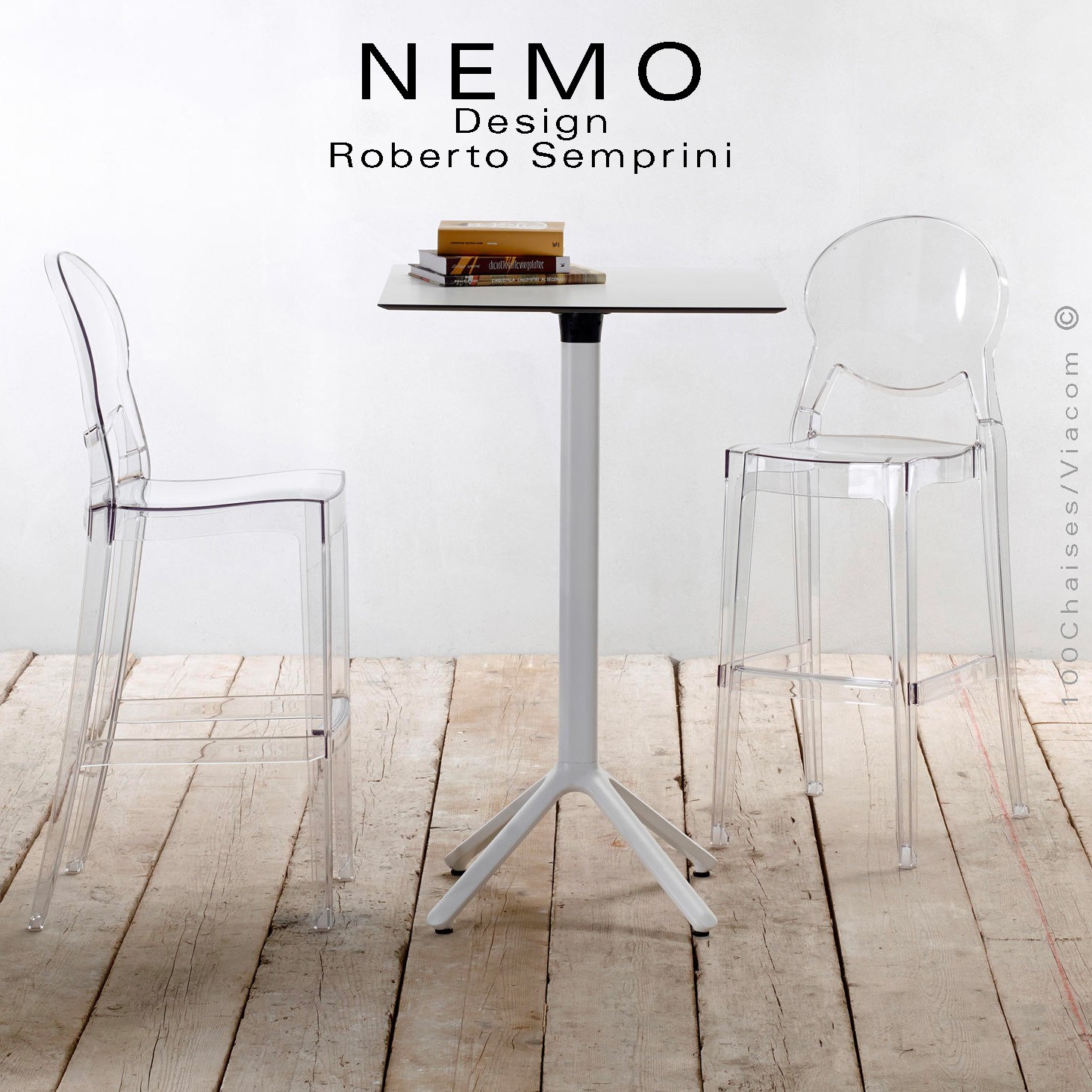La table de bar pliante Nemo a une base avec une structure de 4 pieds ou quatre branches, une colonne carrée à coins arrondis et des fixations en aluminium moulé sous pression, disponible en couleur anthracite, blanc, gris et gris Tourterelle. La base pliante est munie d'une poignée pour faciliter l'alignement de plusieurs tables. Le plateau en stratifié compact a une épaisseur de 10 ou 12 mm., équipé de 8 bagues de fixation pour assurer la stabilité du plateau à la structure. Disponible en versions ronde et carrée, en différentes dimensions et finitions. Le chant ou bord du plateau peut-être incliné ou droit de couleur noir.