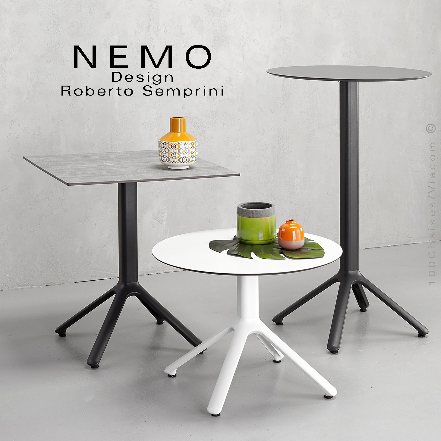 Table repas design NEMO MAXI, pour café, hôtel, restaurant, CHR. mais aussi pour la maison, terrasse, jardin, balcon. Piétement 4 branches fonte d'aluminium moulé, base 600x600 mm., colonne 80x80 mm., coins arrondis, peinture blanche, anthracite, +4 molettes réglables et tampons de protections des sols. Plateau rabattable Compact épaisseur 10, 12 mm. au choix (voir nouvelles finitions compact 2023 - Palette image - Sur demande). Chant noir, incliné sous plateau ou droit suivant choix. Convient pour l'extérieur.
