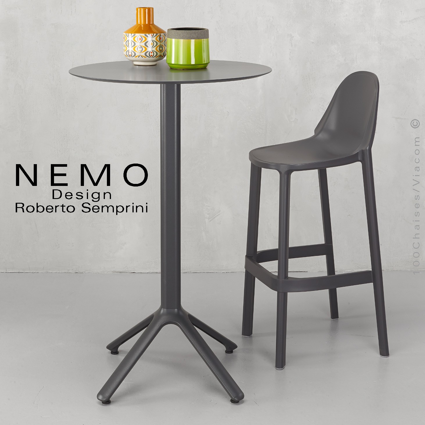 Table NEMO, pour CHR., piétement encastrable aluminium couleur blanc, plateau Ø60 cm., rabattable compact anthracite.