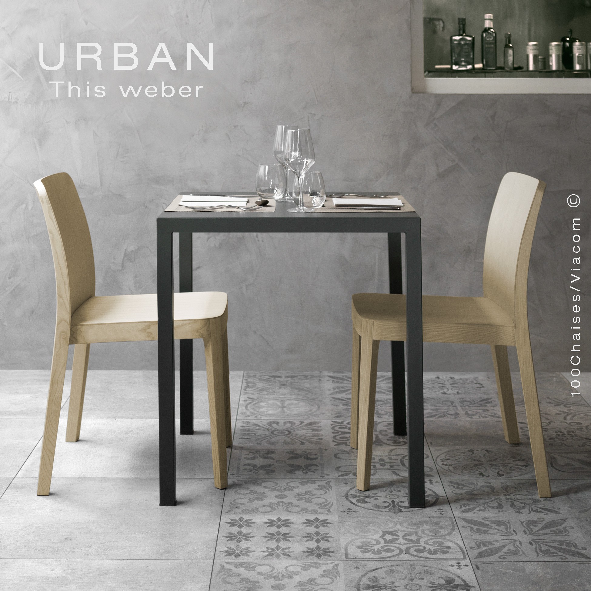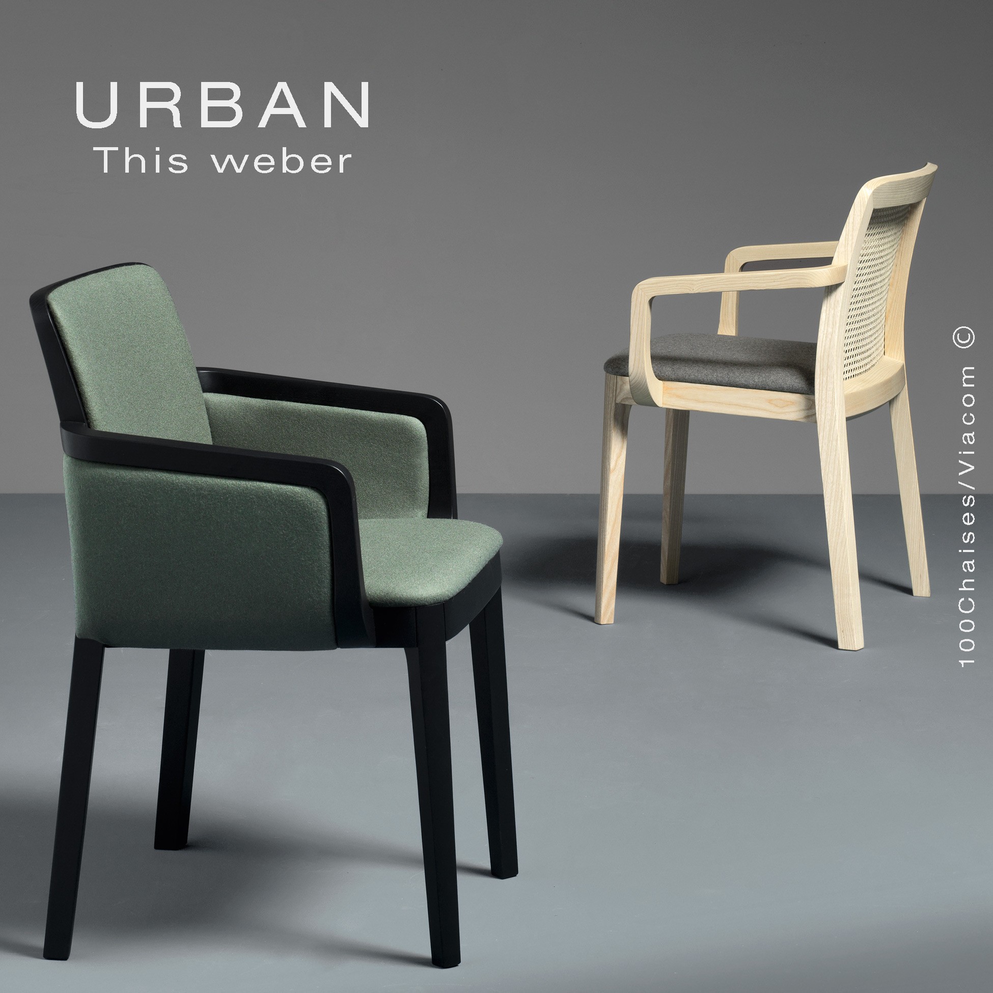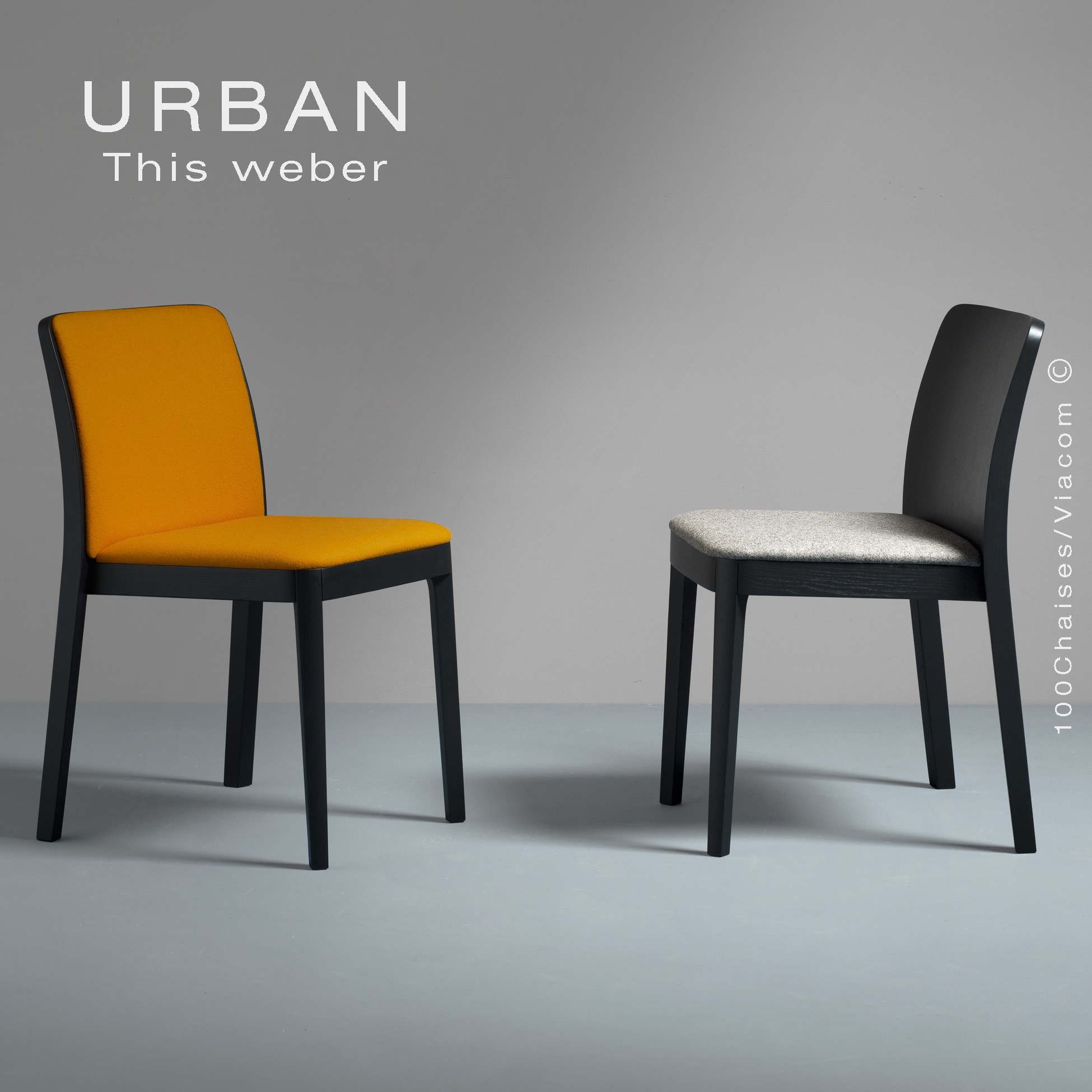 Chaise URBAN pour les restaurants, cafés, hôtels (CHR) ou particulier. Structure et Piétement 4 pieds en bois de frêne, peint blanc, gris, noir ou teinté naturel, Noyer Teck, Wengé. Avec tampons de protections des sols, empilable par 4. Assise et dossier garni de mousse polyuréthane, habillage tissu du fabricant PUGI.RG, gamme FENICE. Autres tissus disponibles. Info : commandes@100chaises.fr