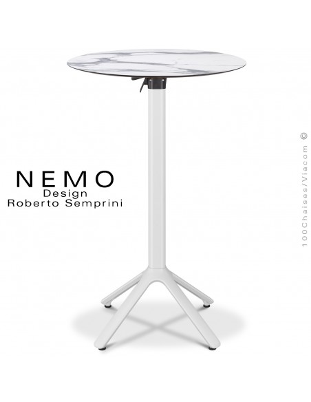 Table mange debout NEMO, piétement encastrable aluminium peint blanc, plateau rabattable Ø80 cm., compact marbre blanc.