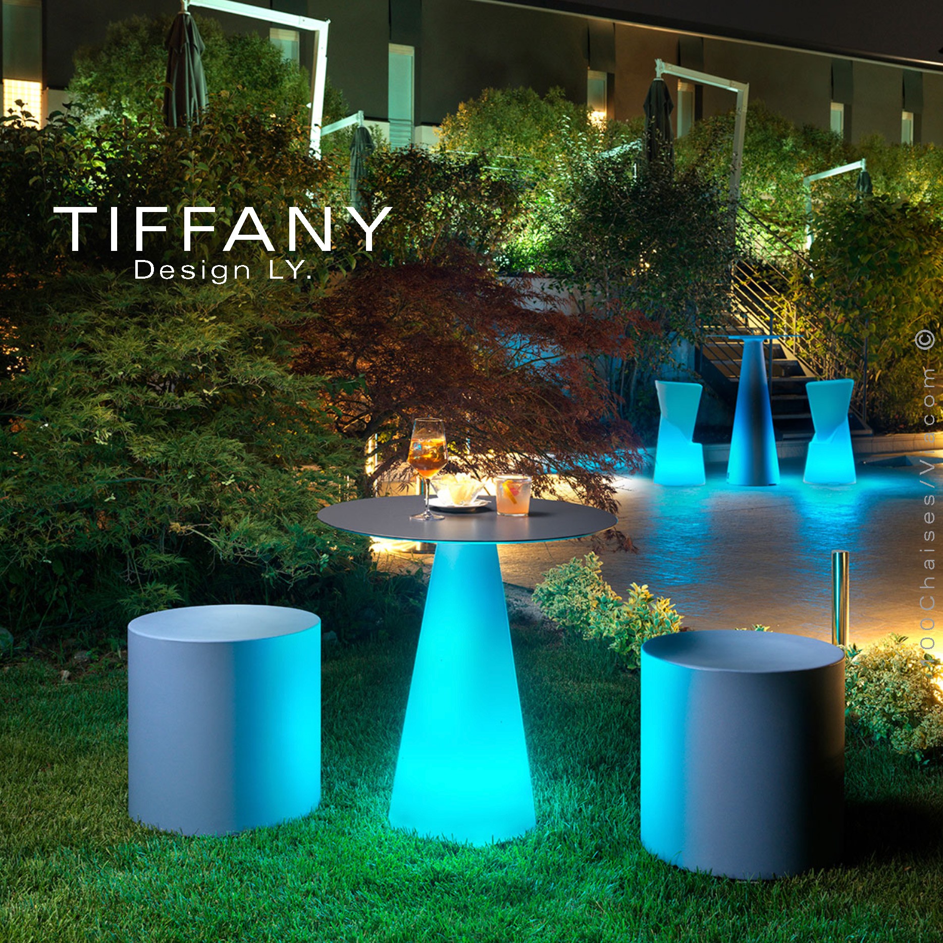 Collections / table pour café, hôtel, restaurant TIFFANY. La collection de table TIFFANY est conçue pour l’extérieur, terrasse, café, hôtel, restaurant. Table à usage domestique ou professionnel. Les plateaux compact HPL, sont disponibles en cinq tailles (60x60 / 70x70 / Ø60 / Ø70 / Ø80 cm.) de formes carrés ou rondes. Ils s’adapteront à tous les espaces avec leurs trois couleurs noir, blanc, et marron. Le piétement plastique en polyéthylène est réalisé par la technique de rotomoulage teinté dans la masse. Il est disponible en deux hauteurs 72 cm. et 110 cm., proposés en 7 coloris blanc, bleu, bleu clair, jaune, marron, noir, rouge. Les colonnes ou piètements sont disponibles en version lumineuse, ils donneront à votre terrasse une ambiance tamisé, douce et chaleureuse.