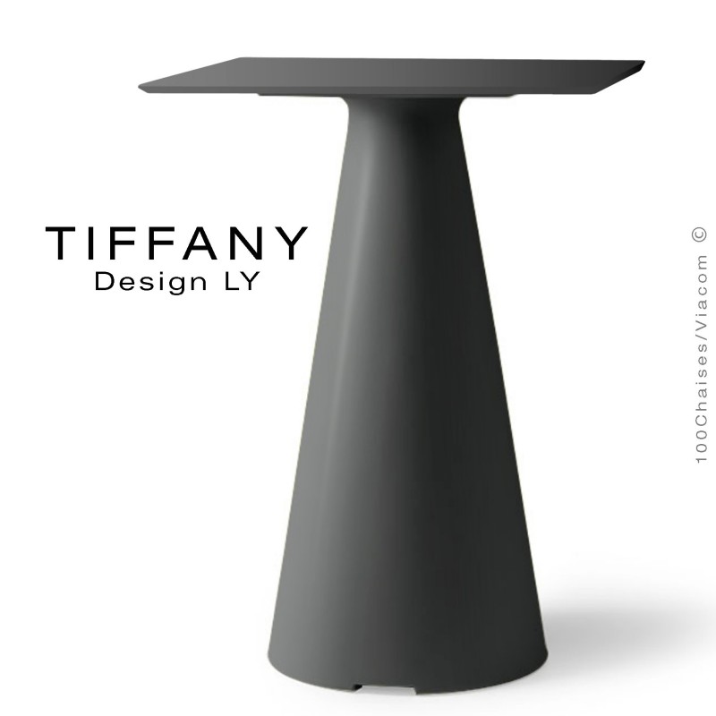 Table TIFFANY, pour extérieur, café, hôtel, restaurant. Piétement colonne centrale plastique conique en polyéthylène, base 35x35 cm., hauteur 72 cm., option sur demande avec système de pieds réglables (mise à niveau). Plateau compact carré 60x60, 70x70 cm., épaisseur 1 cm., avec chant incliné sous plateau. Couleurs : blanc noir ou marron. Pour les tables équipées des plateaux Ø80 cm. et 70x70 cm., le piétement est livré avec une base ou platine stabilisatrice.