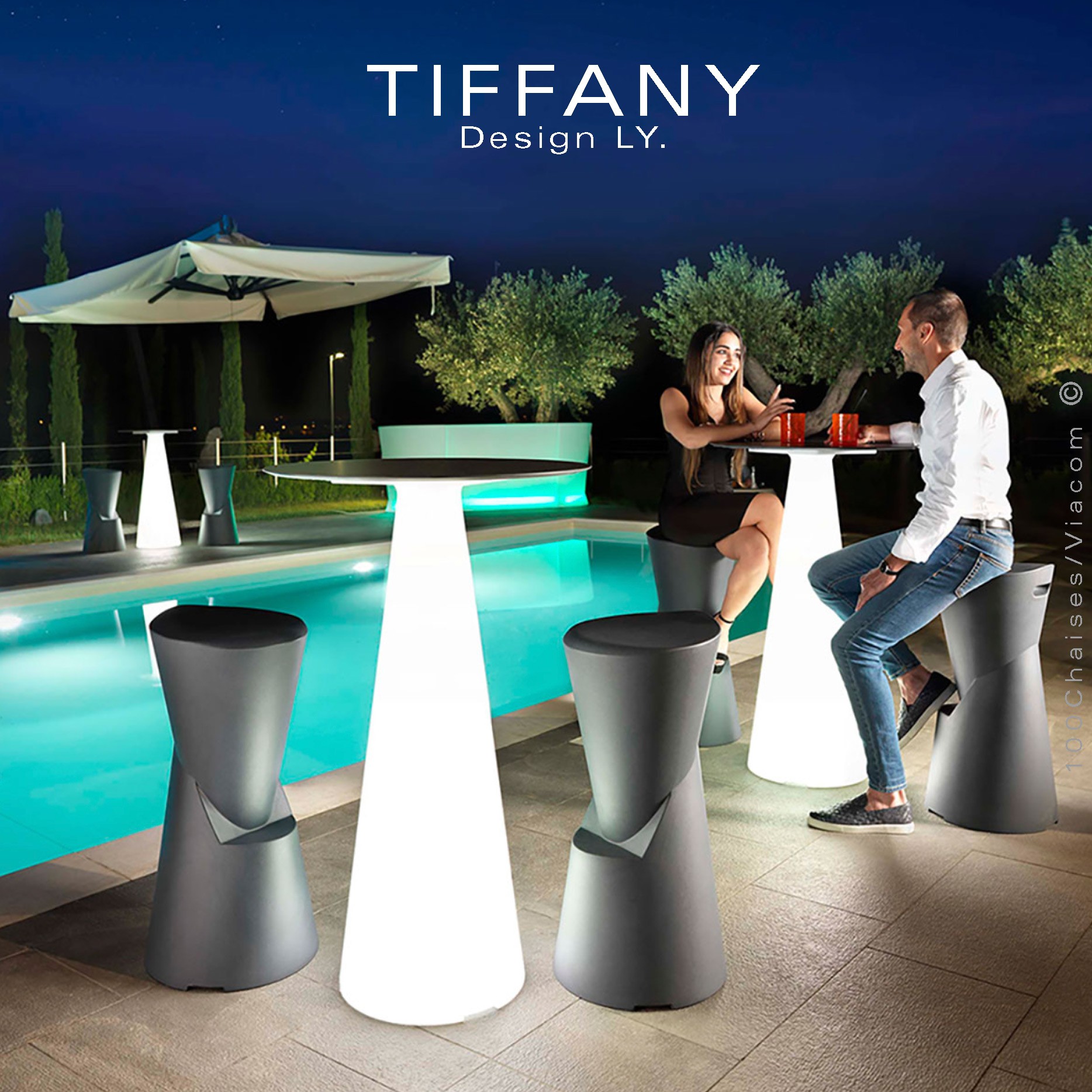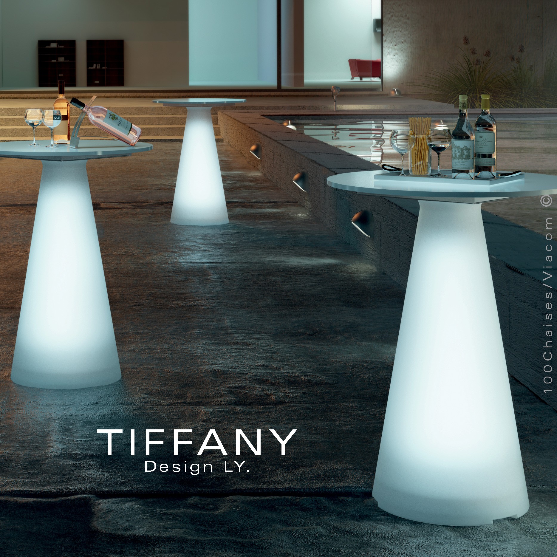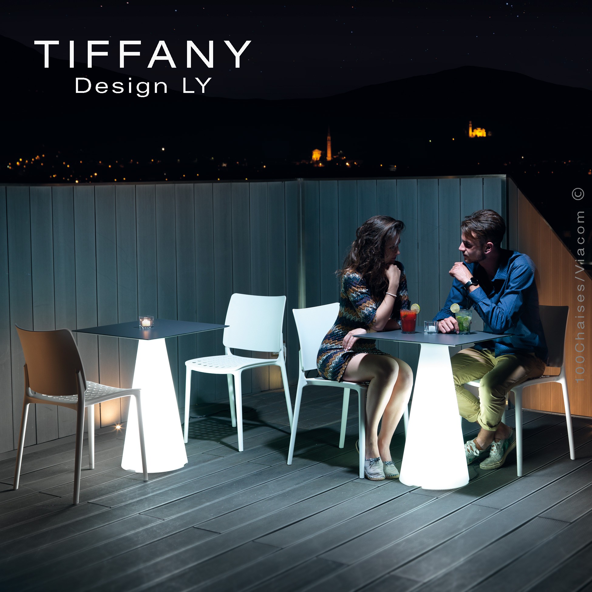 Collections / table pour café, hôtel, restaurant TIFFANY. La collection de table TIFFANY est conçue pour l’extérieur, terrasse, café, hôtel, restaurant. Table à usage domestique ou professionnel. Les plateaux compact HPL, sont disponibles en cinq tailles (60x60 / 70x70 / Ø60 / Ø70 / Ø80 cm.) de formes carrés ou rondes. Ils s’adapteront à tous les espaces avec leurs trois couleurs noir, blanc, et marron. Le piétement plastique en polyéthylène est réalisé par la technique de rotomoulage teinté dans la masse. Il est disponible en deux hauteurs 72 cm. et 110 cm., proposés en 7 coloris blanc, bleu, bleu clair, jaune, marron, noir, rouge. Les colonnes ou piètements sont disponibles en version lumineuse, ils donneront à votre terrasse une ambiance tamisé, douce et chaleureuse.