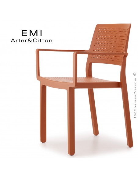 Fauteuil design EMI, pour extérieur, jardin, terrasse, café, hôtel, restaurant (CHR). Assise et dossier perforé avec accoudoir. Piétement 4 pieds en plastique ou techno-polymère, avec tampons plastiques de protections des sols. mobilier empilable. Couleurs disponibles : anthracite, gris tourterelle, blanc, bleu clair, terracotta, vert, gris.
