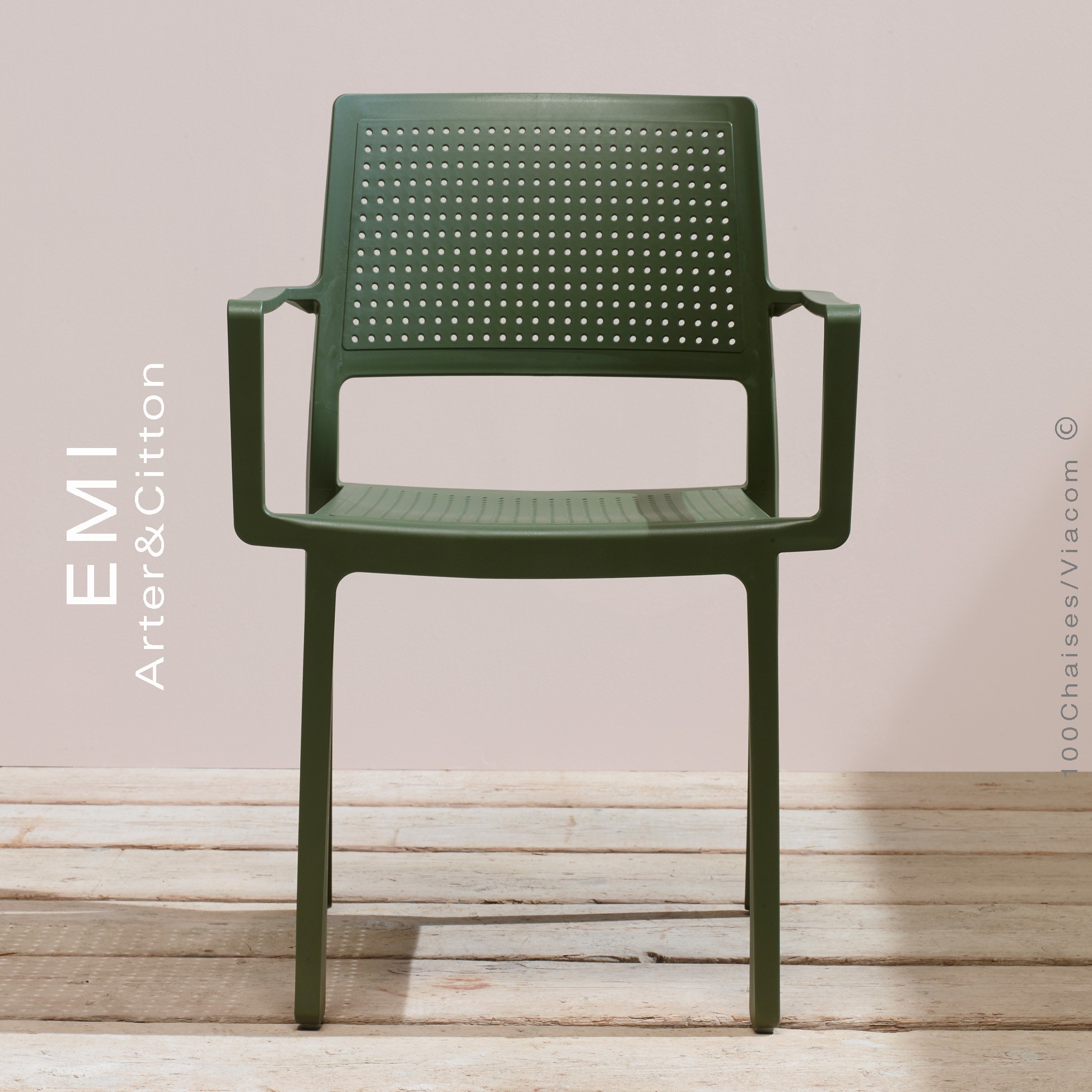 Fauteuil design EMI, avec accoudoirs pour extérieur, terrasse et jardin, structure plastique couleur, empilable.