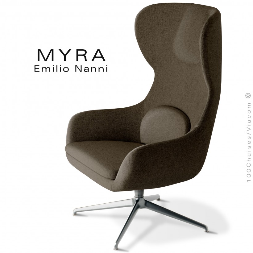 Fauteuil confort ou bergère design MYRA, pour hôtel, café, restaurant CHR, mais aussi pour la maison, salon lounge ou collectivités. Assise et dossier garnis de mousse polyuréthane, habillage tissu gamme Medley du fabricant Gabriel, composition 100% PL., ignifugé - BS EN 1021 1&2 Cigarette and Match. Couleur voir palette tissu au choix. Piétement étoile ou quatre branches en fonte d'aluminium, pivotant à 360°. Avec tampons plastiques de protections des sols. Autres tissus tissés, feutres ou aspects cuir synthétique disponible. Vos demandes à commandes@100chaises.fr