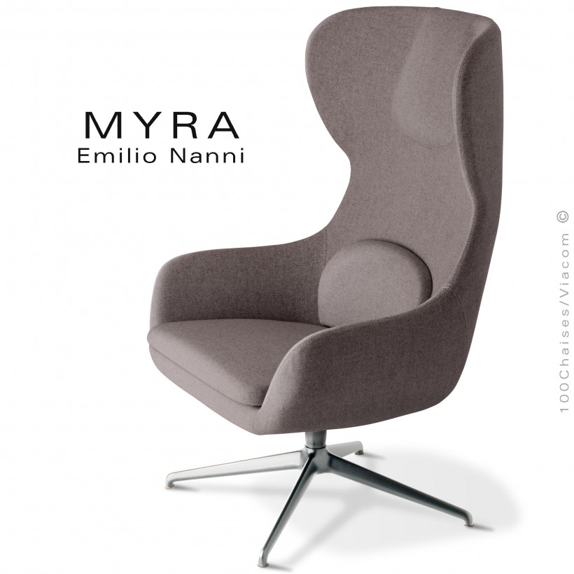 Normes européennesFauteuil confort ou bergère design MYRA, pour hôtel, café, restaurant CHR, mais aussi pour la maison, salon lounge ou collectivités. Assise et dossier garnis de mousse polyuréthane, habillage tissu gamme Medley du fabricant Gabriel, composition 100% PL., ignifugé - BS EN 1021 1&2 Cigarette and Match. Couleur voir palette tissu au choix. Piétement étoile ou quatre branches en fonte d'aluminium, pivotant à 360°. Avec tampons plastiques de protections des sols. Autres tissus tissés, feutres ou aspects cuir synthétique disponible. Vos demandes à commandes@100chaises.fr